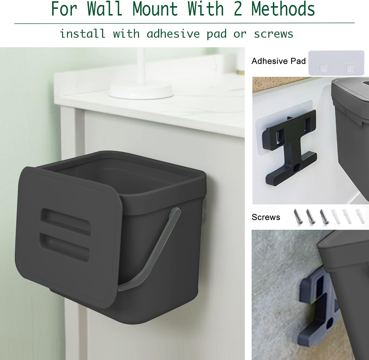 - Wall Mount/Under Sink/Countertop Trash Can: The trash can with lid can be easily hung on kitchen cabinet doors, pantry doors. (The thickness of the door should be less than 0.86 inch) Moreover, this small waste basket can also be wall-mounted to under sinks, cupboard, kitchen wall or bathroom wall with adhesive pad or screws.