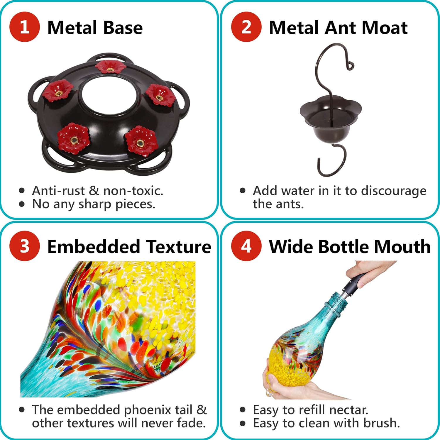 LUJII Hand Blown Glass Hummingbird Feeder for Outdoors with Ant Moat, Leak Proof & Rustproof,36 fl.oz, Metal Base Cover with 5 Feeding Ports & 5 Perches, Glass Art for Garden Decor (Blue Mixed Yellow)