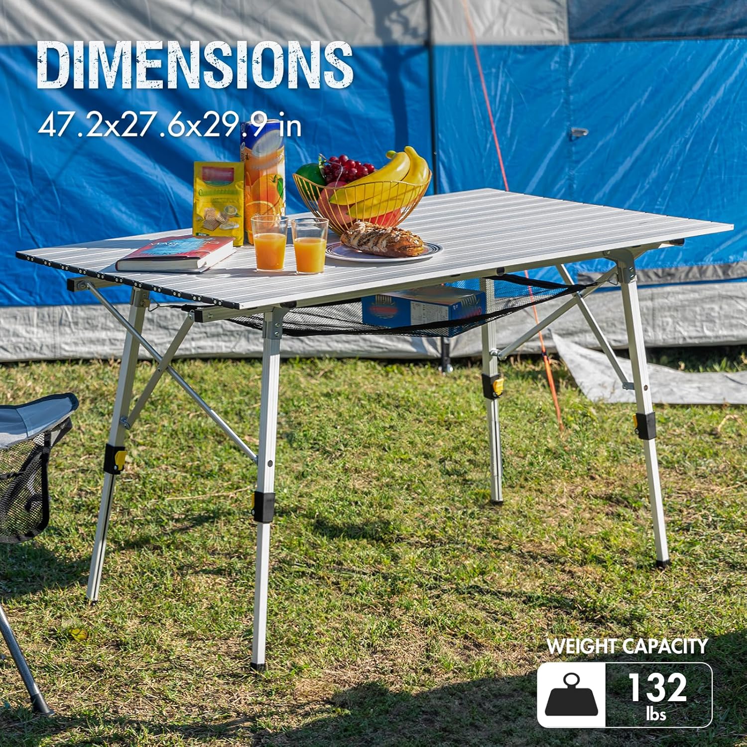 - Extra Storage Spcce and Larger Table Top: Removable storage mesh layer can be installed under our adjustable table, which is a great place to put books, snacks and small kitchen tools when camping or cooking. It can be removed quickly from the legs when you don't need it