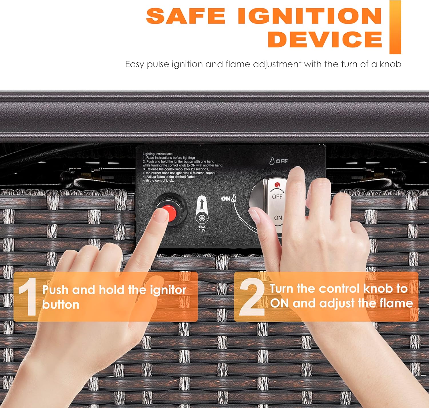 - SAFE & CSA CERTIFICATION: CSA-approved outdoor gas fire pit table has standard 20-pound propane tank (Not included) at 50,000 BTU. Dual-tube stainless steel burner allows you to light the table safely, just push the button and turn the control knob to adjust the flame to the desired temperature