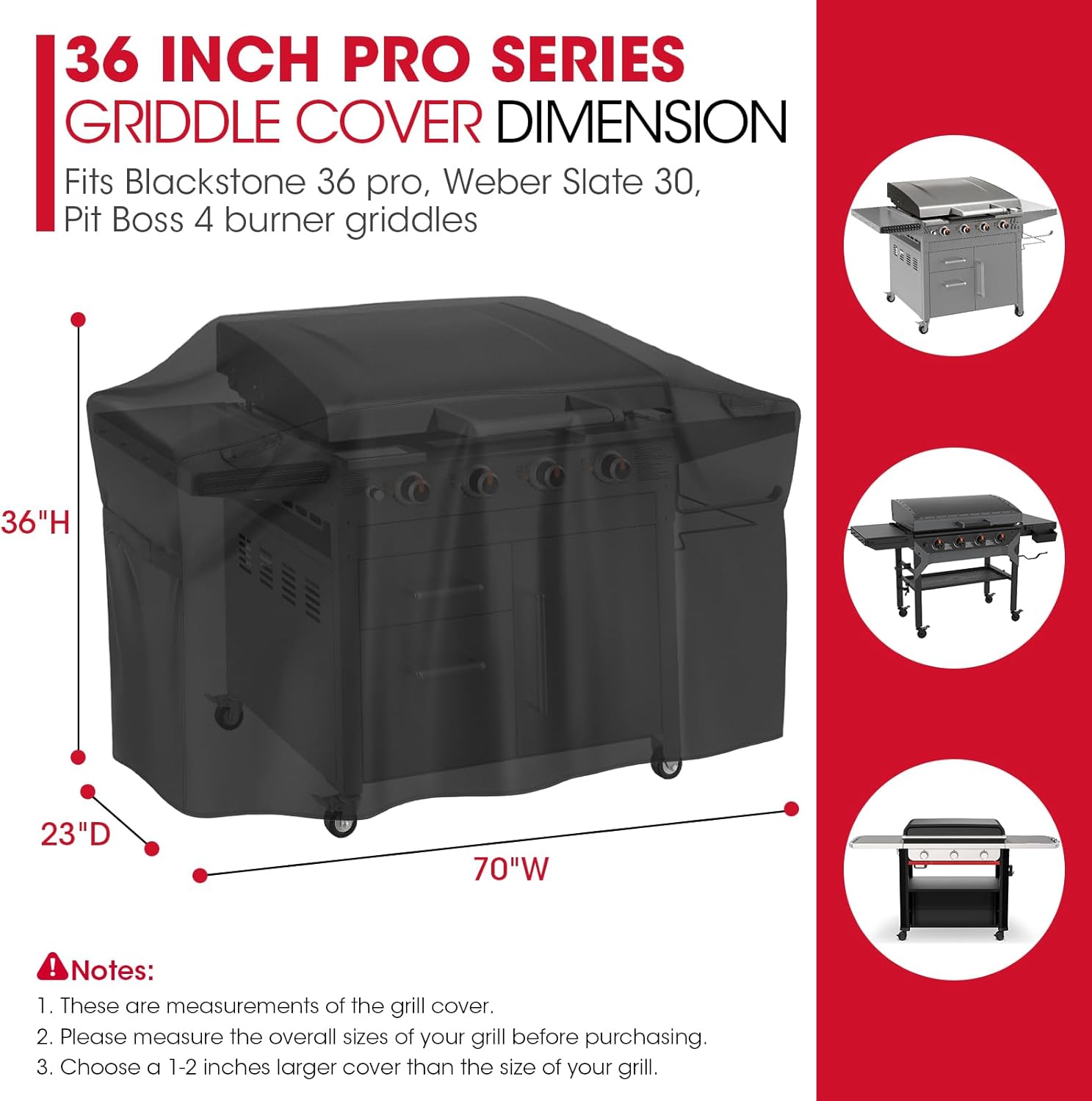 - 36 Inch Pro Series Griddle Cover Dimensions: 70 inch flat grill cover measures 70"W x 23"D x 36"H, designed to fit for Blackstone 36" pro series griddle and griddle with hood, also other griddles with similar size. Please measure your grill before purchasing