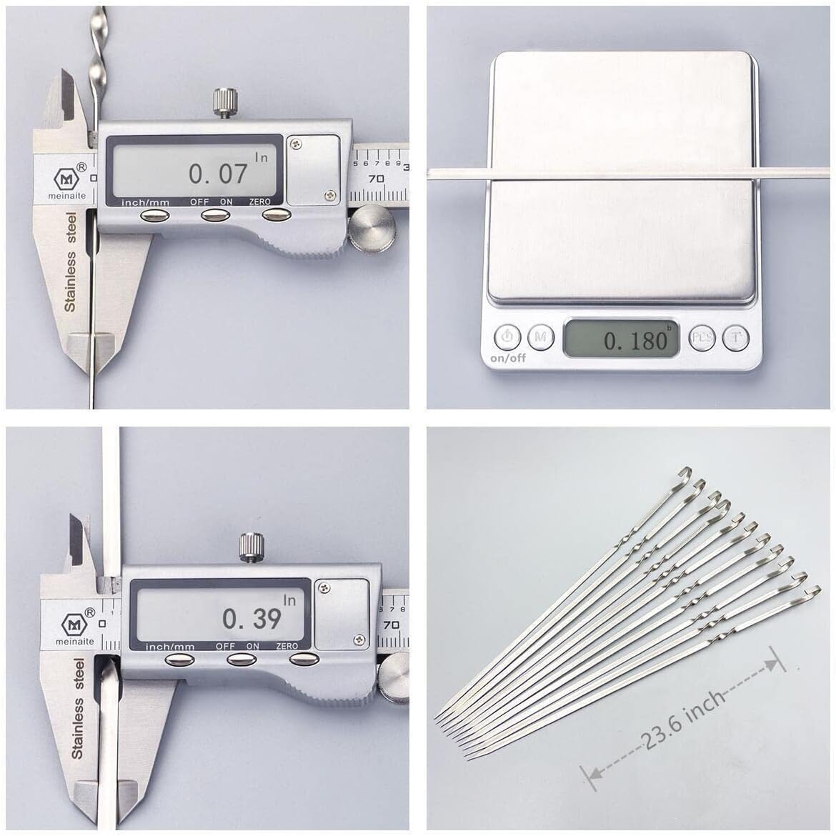 - PRECAUTIONS:1. Children should be supervised by adults when they are used. Stainless steel skewers are very sharp. 2. After useing, just let these grilling skewers sit in warm water, hand wash with gentle detergent or threw them in dishwasher, wipe away water and keep in dry place, and they’ll come out as new. It is recommended to store the barbecue stick in a cool, dry and ventilated place. 3.We Manufacturing products attentively,The BBQ skewers are large, please buy it carefully