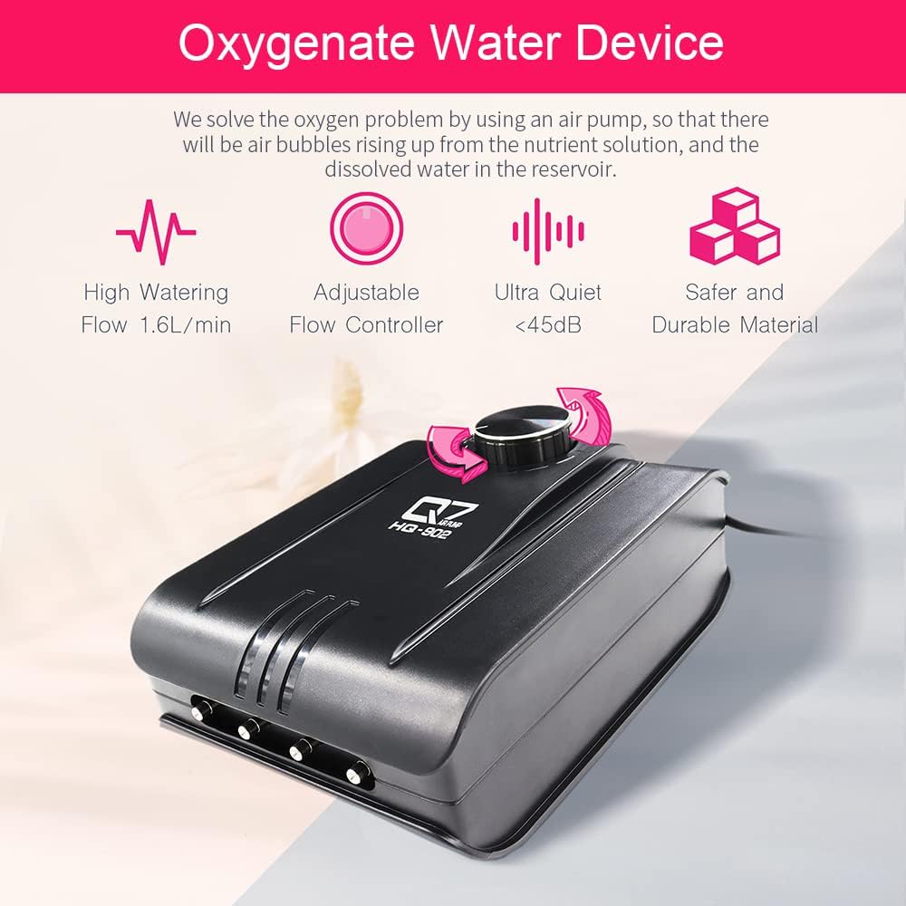 - EFFICIENT AIR PUMP KITS: Air Pump with 4 outlets, includes 4x Check Valve, 4x Air Stone, 4x 5ft Air Tubing. Large air outlet, adjustable air flow is up to 1L/min and UP TO 265 gallons. Air Stone is an ideal way to add oxygen to your hydroponic growing system and create tiny bubbles rather than bigger ones. Oxygenation of hydroponic reservoirs using air pumps is vital for the health of root system.