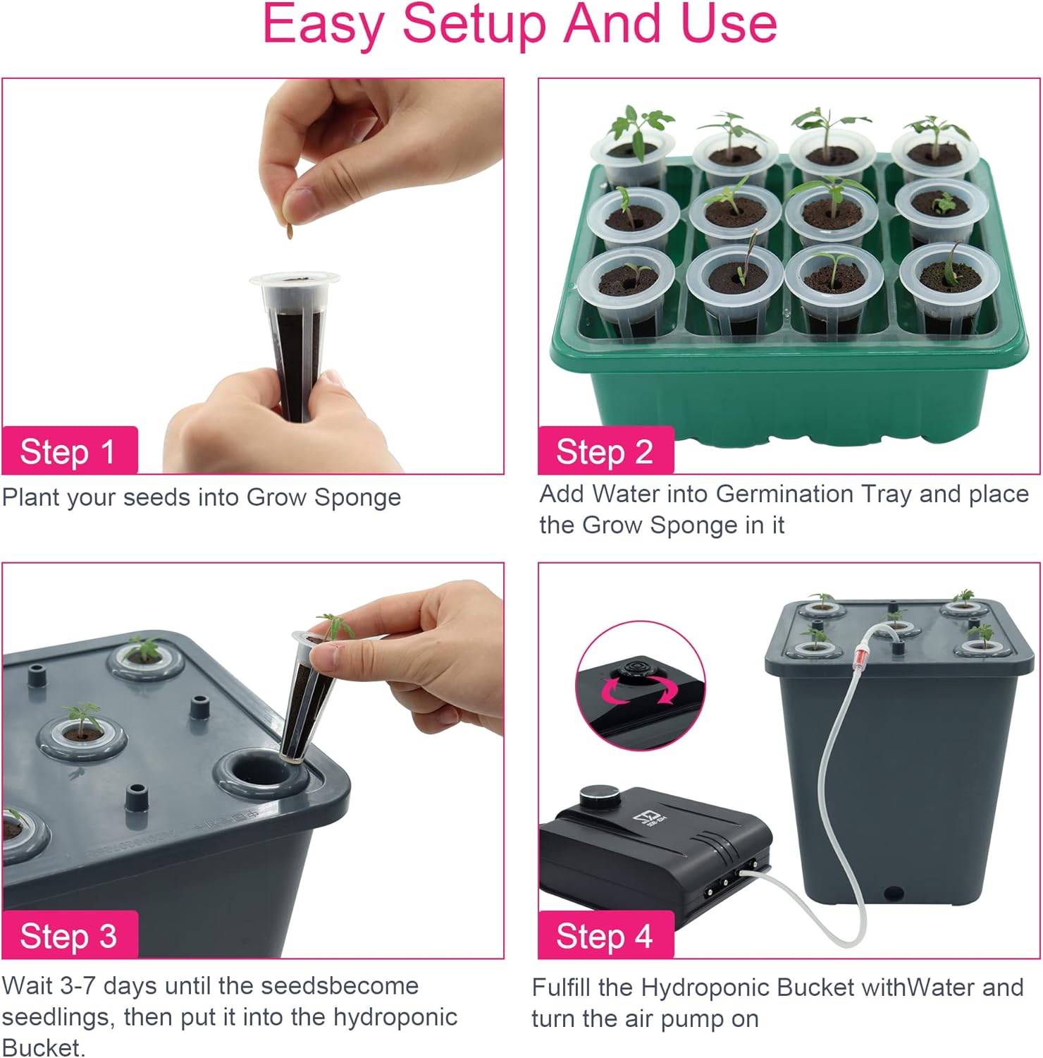 - HELPFUL GERMINATION KITS: 2x Germination Tray, 24x Grow Sponges, 24x Grow Baskets, 16x Sponge cube. The Grow Sponges are pH balanced plant sponge and contains micronutrients to promote healthy root growth. Germination Tray contains 12-cell Tray and Vented Humidity Dome, which help regulate moisture and temperature for germinating seeds.