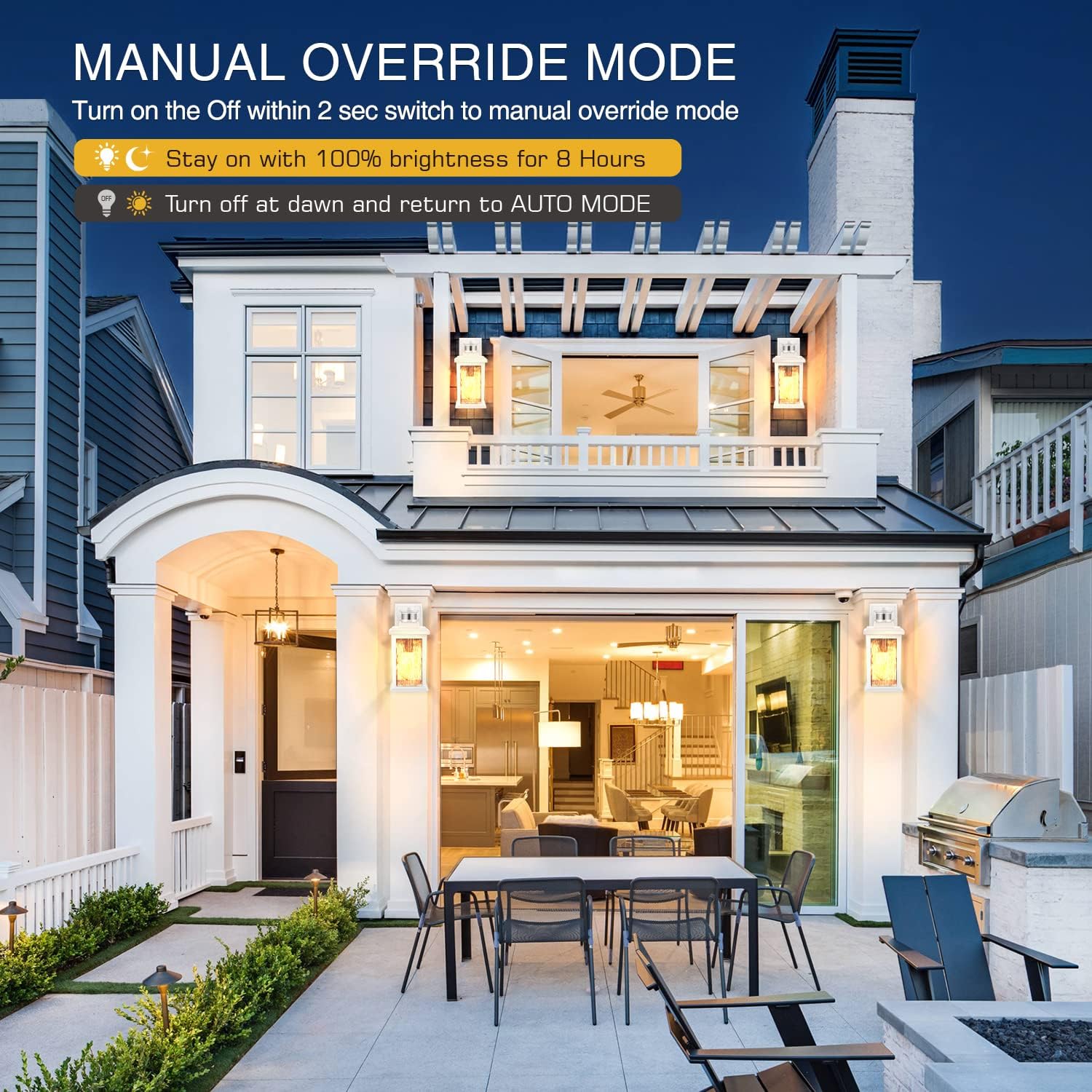 - ☀️【Unique Manual Override Mode】This outdoor lanterns for front porch could continuously be on 100% brightness at night. Such as party scenes. to shift to manual mode from auto one and turn wall switch “off-on” with 0.5~2sec... in this mode, the exterior light fixture will turn on and keeping 100% brightness for approximately 8 hours but will auto turn off at dawn.