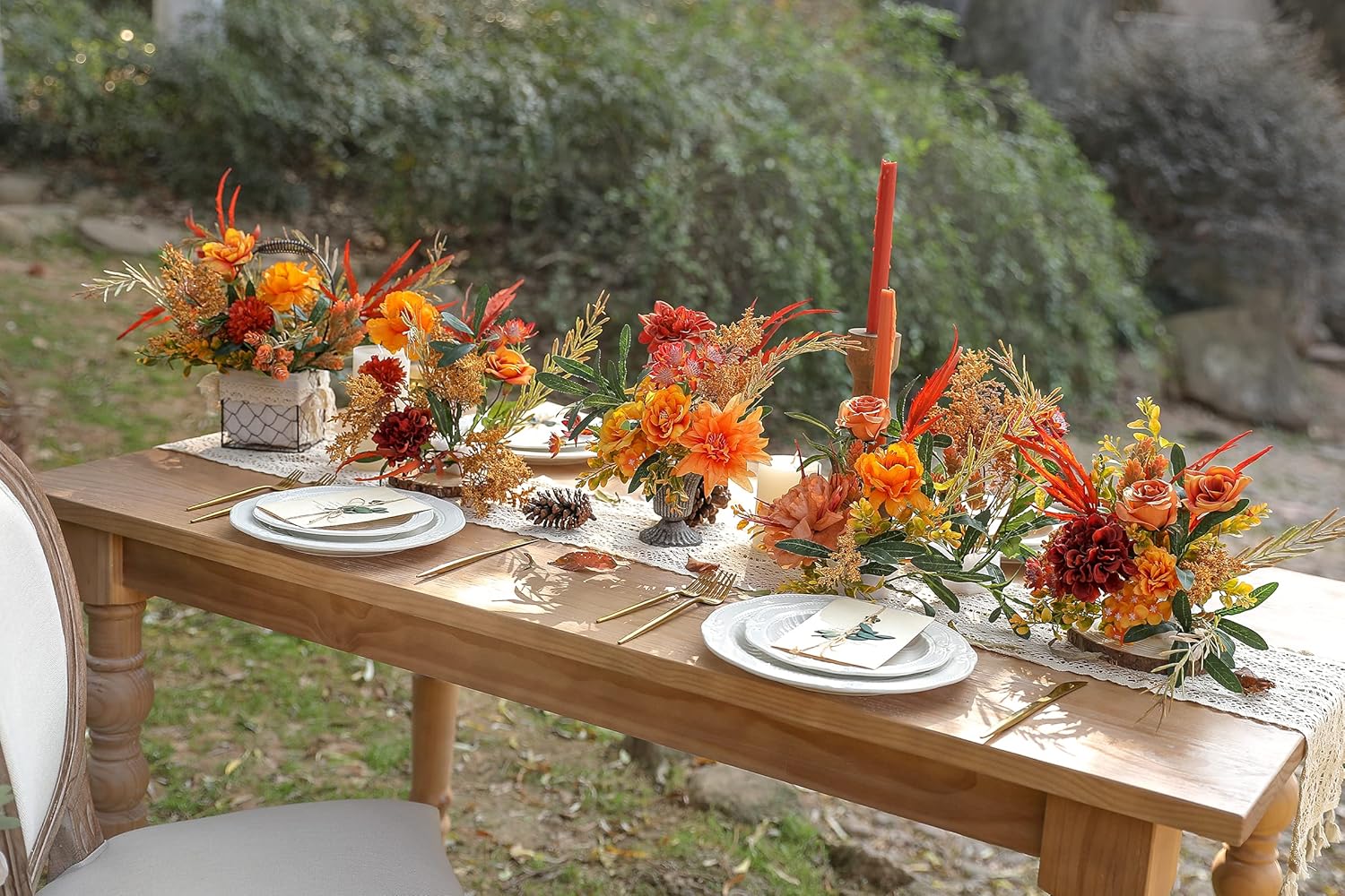 - Flower Details:Orange and red dahlia flowers x3 pcs(assorted sizes); Orange rose x7 pcs(assorted sizes);Orange Peony x2 pcs(assorted sizes);Gradient color Hydrangea x3 pcs(assorted sizes);Hydrangea branchx3 pcs;Orchid Branchesx5 pcs;Other vanilla berry branches x2pcs;Red berriesx2pcs;green leaves x43pcs;Flower wired stemsx35pcs;(About 11.8 inches)(Attached Ribbon and hot melt accessories)
