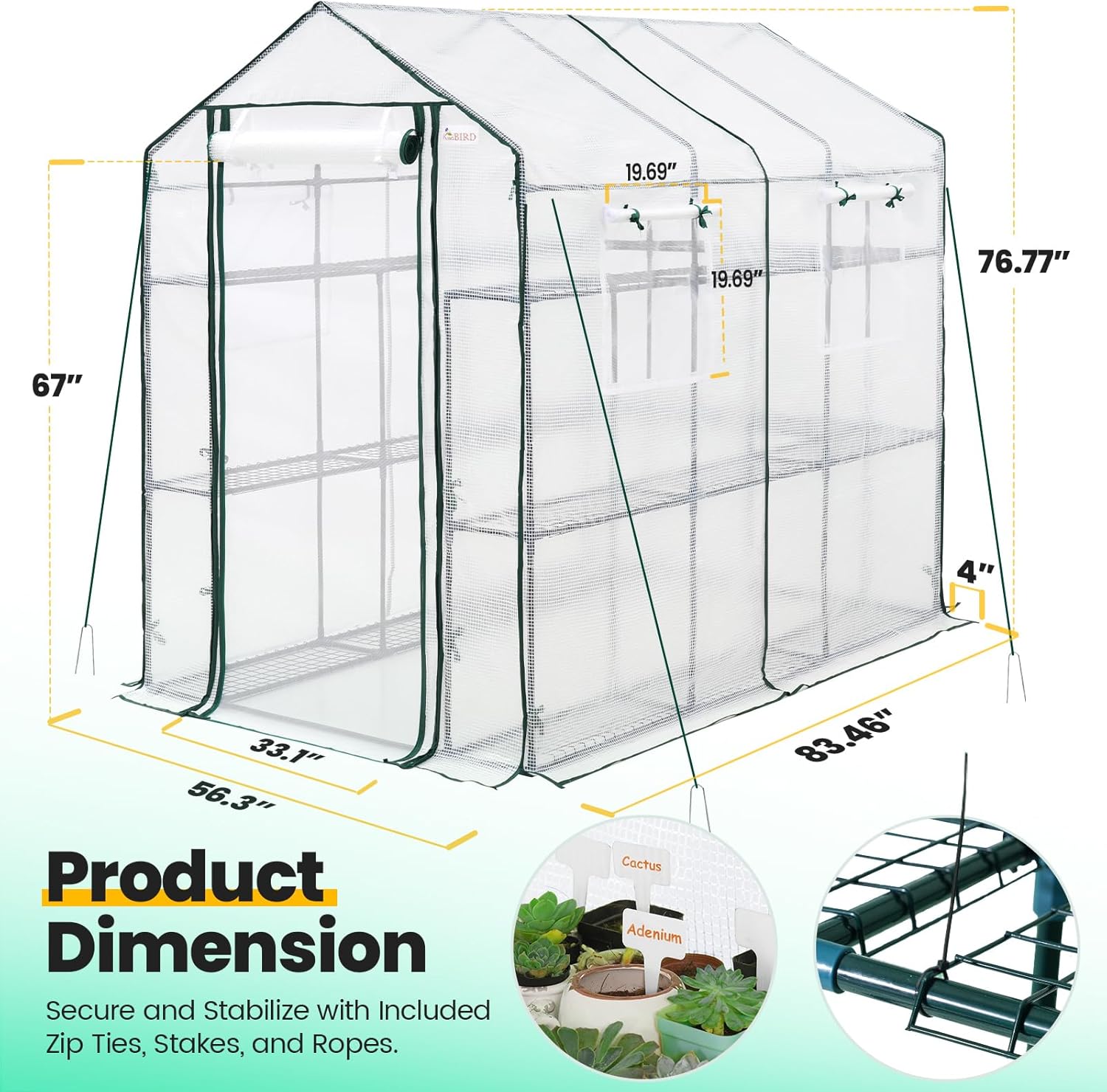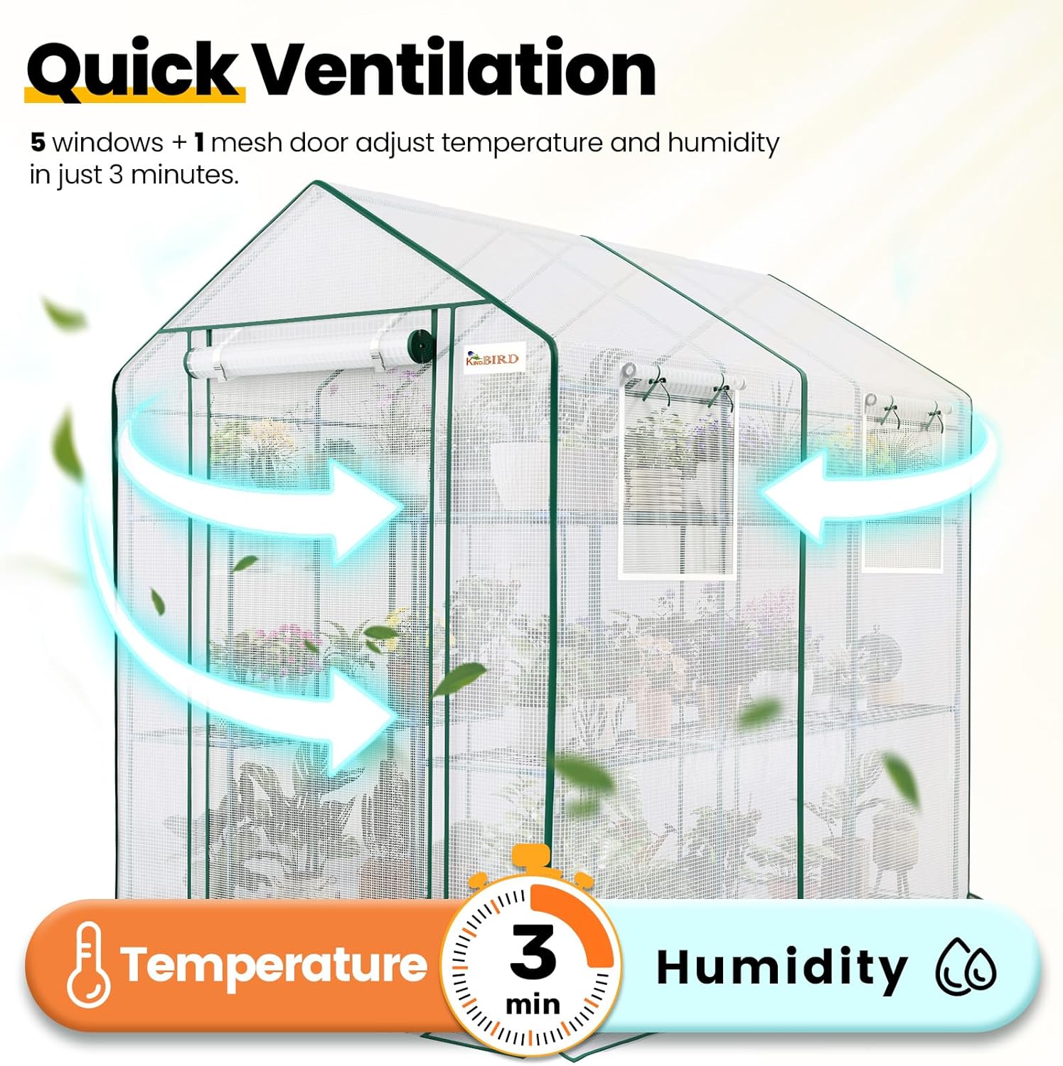 KING BIRD Premium Greenhouse for Outdoors, 84 x 56 x 77 Upgraded PE Cover & Steel Frame Walk in Hot House, w/ Zippered Screen Windows Mesh Door, 3 Tiers 20 Shelves for Outside Garden, White