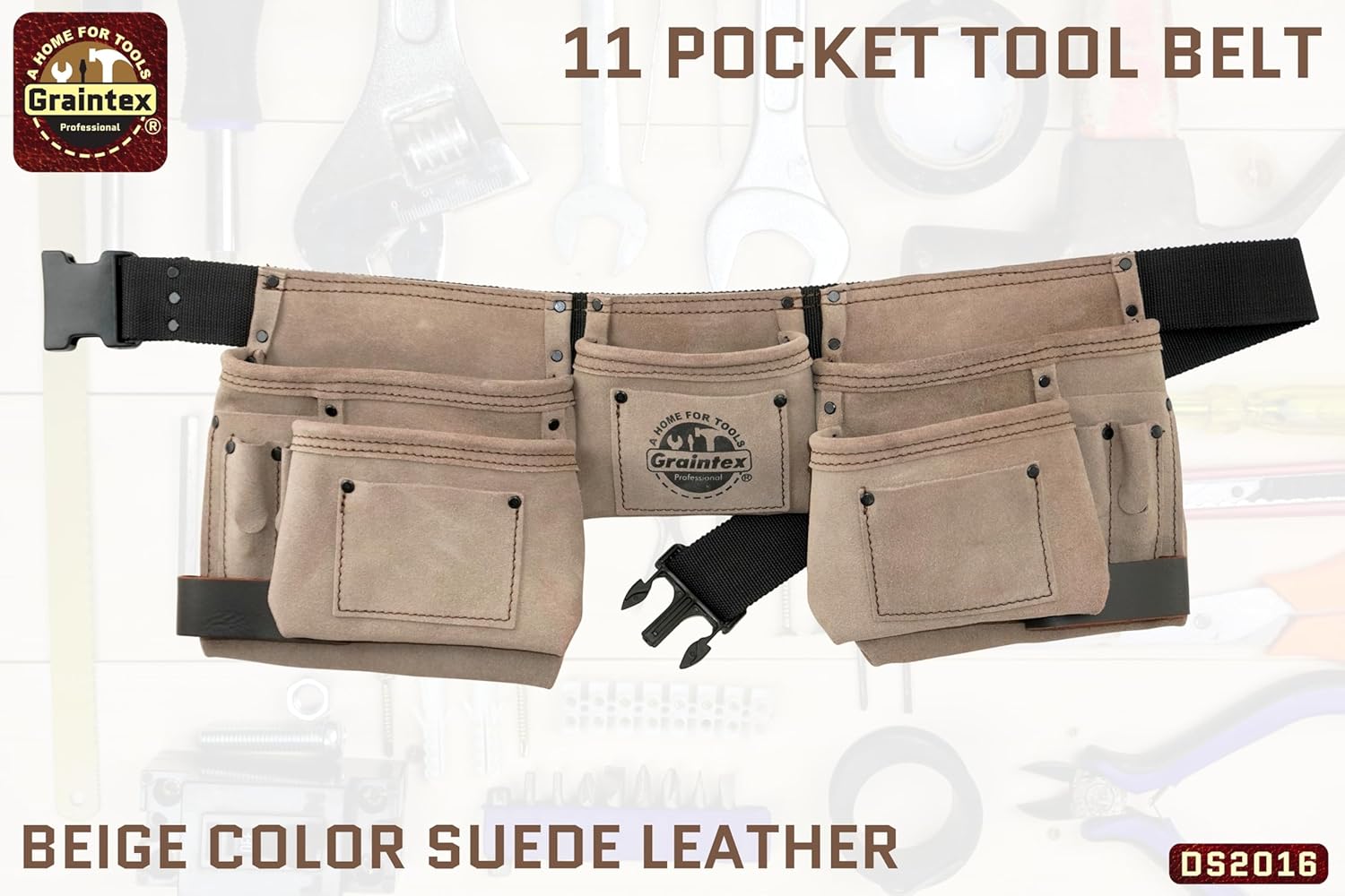 Graintex DS2016 11 Pocket Beige Color Suede Leather Tool Belt/Tool Bag/Work Apron, 2 Hammer Loops, Adjustable Belt | Construction, Carpenter, Roofing, Drywall, Electrician, Gardening, DIY
