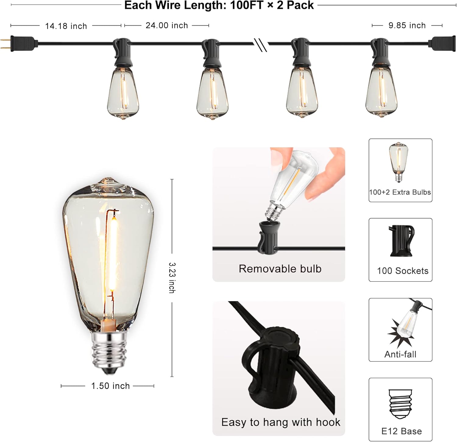 - Dimmable and Energy Saving string lights patio - Outdoor lights for patio set with Dimmable 100 ST38 LED bulbs and 2 Extra bulbs. Outdoor edison lights outdoor have a longer lifespan than incandescent string lights. Our cafe string lights dramatically reduce 90% electricity bills compared with incandescent bulbs ones.