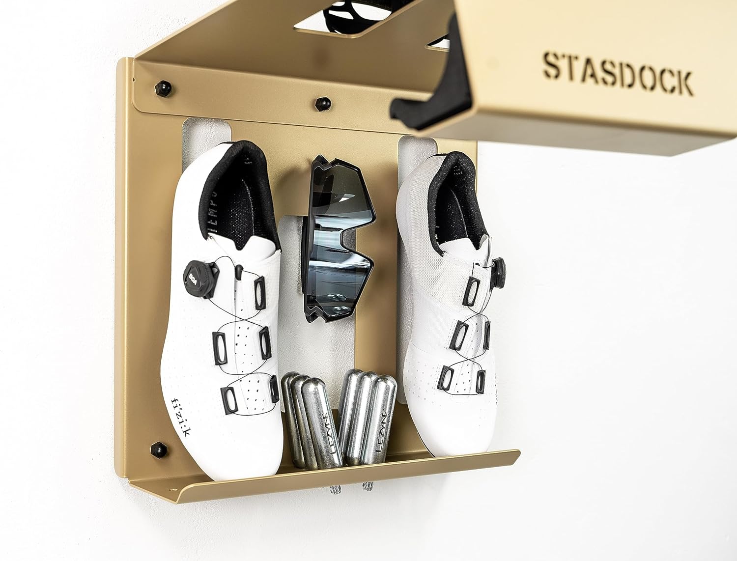 - ✔ DESIGNFUL: Maximize your home or garage space with the Stasdock wall bike rack - designed to securely store your racing bike and its accessories such as shoes, helmet, glasses, and CO2 cartridges.