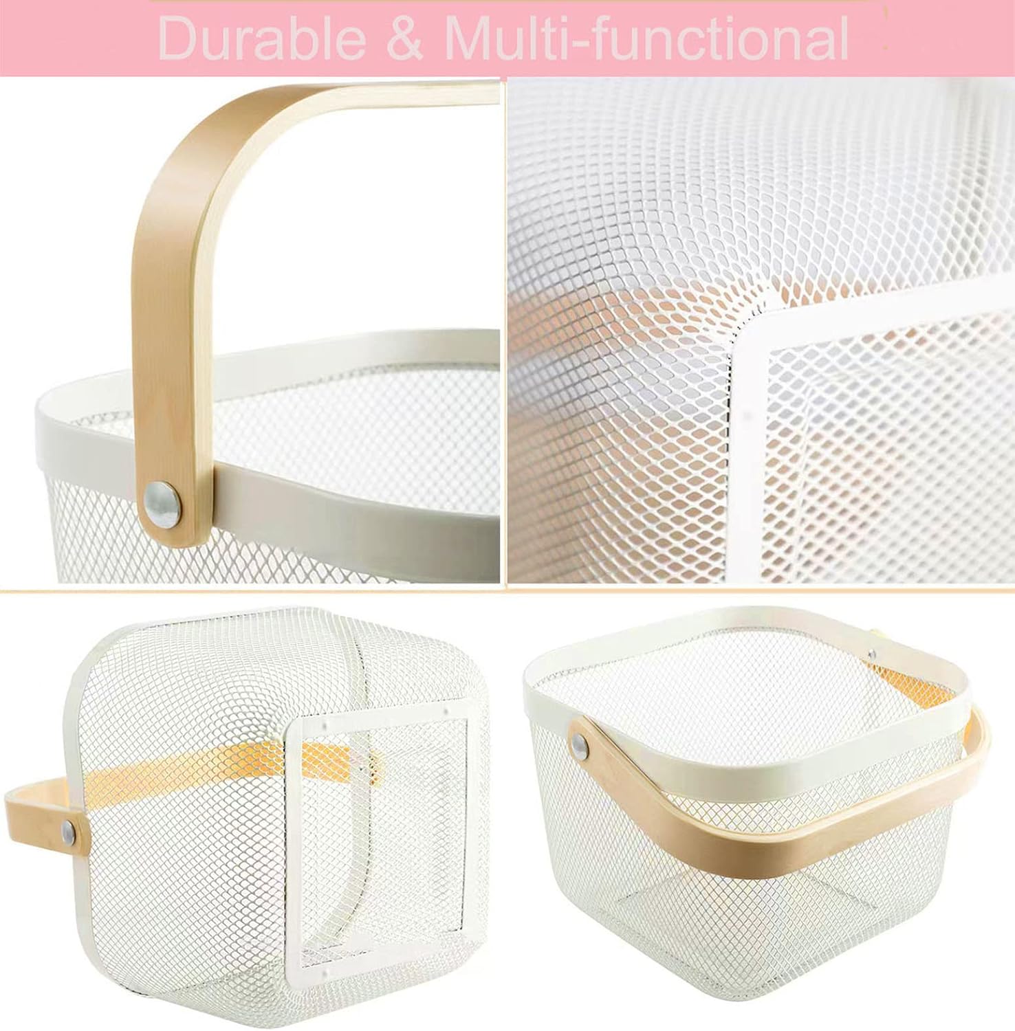 - The metal mesh storage organizer basket bin with bamboo handle is a great way to organize or decorate your home, office, apartment, lofts, or other living spaces. This wire basket also can be a fruit basket or garden basket and storing those fruits and vegetables outside the refrigerator. Also as extra storage to meet your needs for household use.