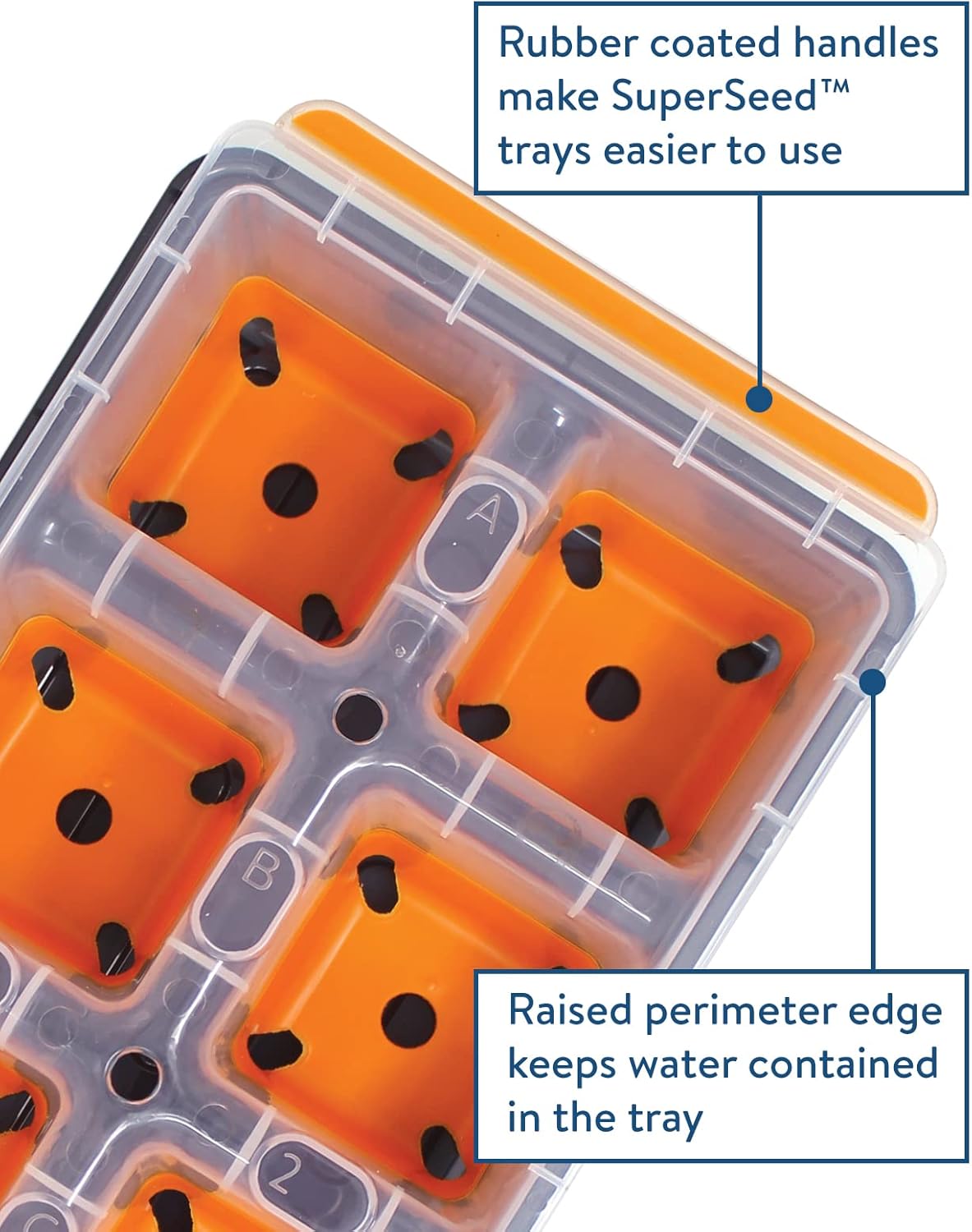 - SMARTER WATERING SYSTEM: Molded corner slots in each cell improve drainage and soil aeration to set your seeds up for germination success. Deep channels in the watering tray draw excess away from the cells, while the raised perimeter edge keeps water contained in the tray - no spills! Seed tray side handles make it easy to lift and pour off excess water or check seedlings daily.