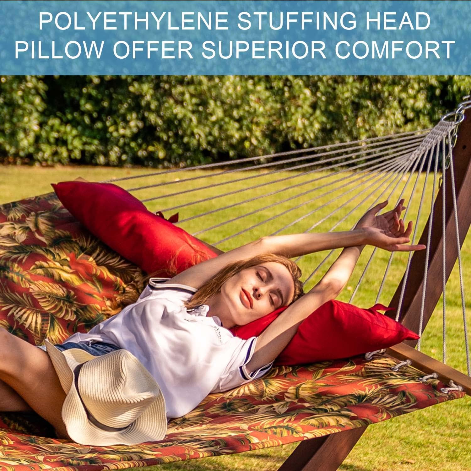 - SUPER COMFY: The double-layered quilted polyester with inner polyester padding and a polyethylene stuffing head pillow offer superior comfort. This quilted hammock can give you a cloud-like comfortable experience. Lying on it is like being in a warm embrace. No matter it's in summer or winter, this hammock will always be your first choice for relaxation.