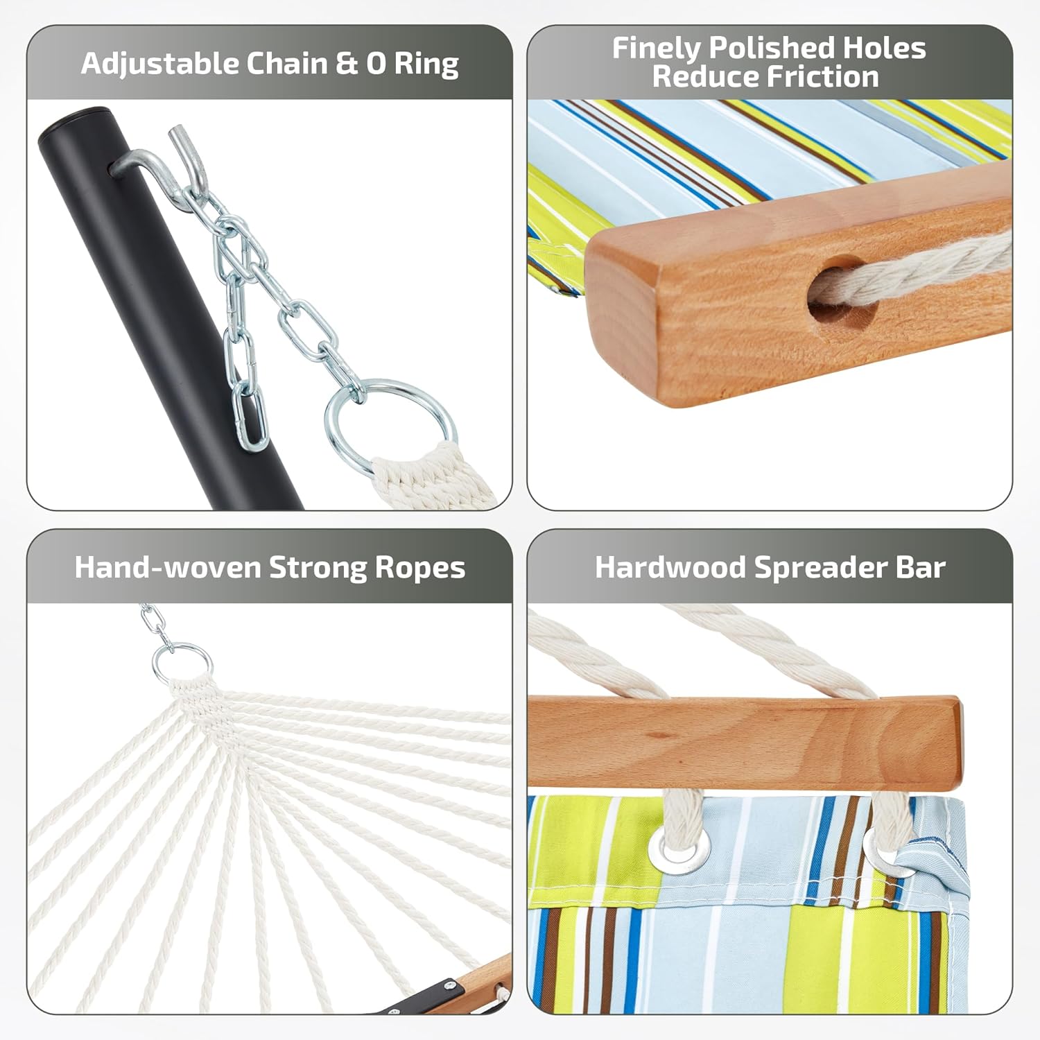 - 【Curved Spreader Bar】The angle of the curved bars make the center of gravity more stable when using. The countersunk spreader bar holes can reduce the friction between rope and wood which make the hammock stands the test of time.