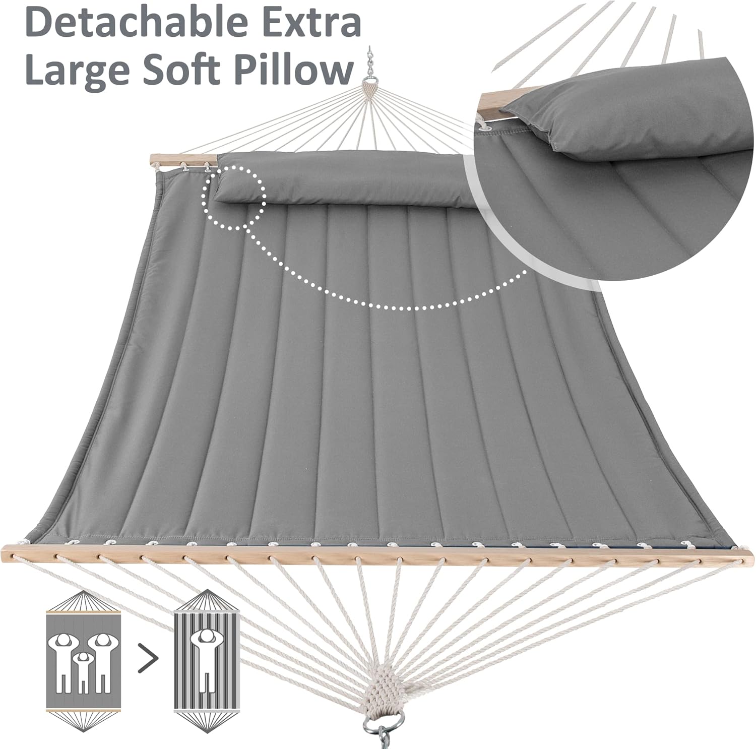 SUNCREAT Portable Double Hammock with Hardwood Spreader Bar, Extra Large Outdoor Hammock with Soft Pillow, 475 lbs Capacity, Light Gray