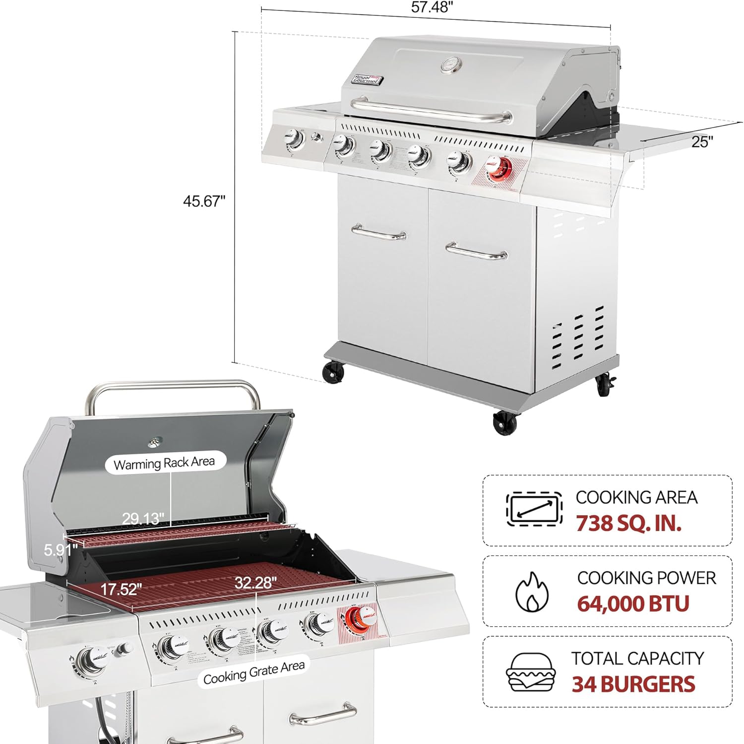 - Spacious Cooking & Prep Space: This 5 burner propane grill offers 738 sq. in. total cooking area—566 sq. in. porcelain-enameled cast iron grates and a 172 sq. in. warming rack, fitting 34 hamburgers. A right side shelf provides prep space for tools & seasonings; the side burner lid folds down for extra room when not in use