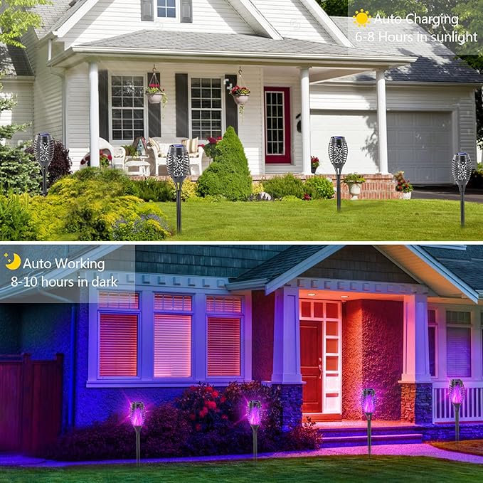 - Easy Installation & Auto On/Off: Solar powered outdoor lights no wiring required, place the outdoor lights on your Lawn, Garden, Flower Bed, Yard, Patio, and Pathways. No electric need; environmentally friendly tiki torches for outside support Auto ON/OFF switch from Dusk to Dawn.