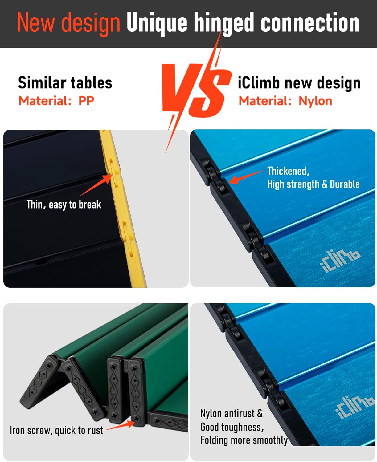 - Ultralight, made of aerospace-grade aluminum alloy, only 2.2 lbs; Max Load 66 lbs; Unlike wooden or nylon-top tables, this table is durable, waterproof, corrosion-resistant, easy to clean; Sturdy joints and anti-slip feet keep the table stable, with legs that won’t fold, bend, or slip on any terrain; Very easy to set up, just open the base frame and attach the tabletop, enjoy your leisure time in seconds, video guide available on this page.