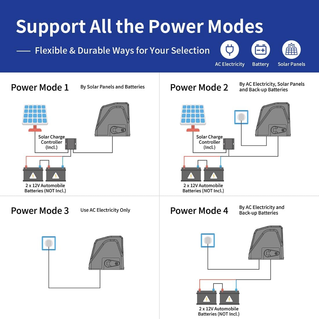 - 【Solar Power Supported】 Flexible power modes are for your selection. Use the included 30W solar panels to charge the battery wherever, whenever there is sunlight! You can add the 24V 12Ah automotive/marine type battery (NOT Incl.) as the main/back-up power source. 2 pcs 12V batteries connected in series for 24V. The energy-conservation and pollution-free solar powered system will operate alone without AC electricity. DKR1100ST gate motor can also be powered by 110-120VAC electricity directly.