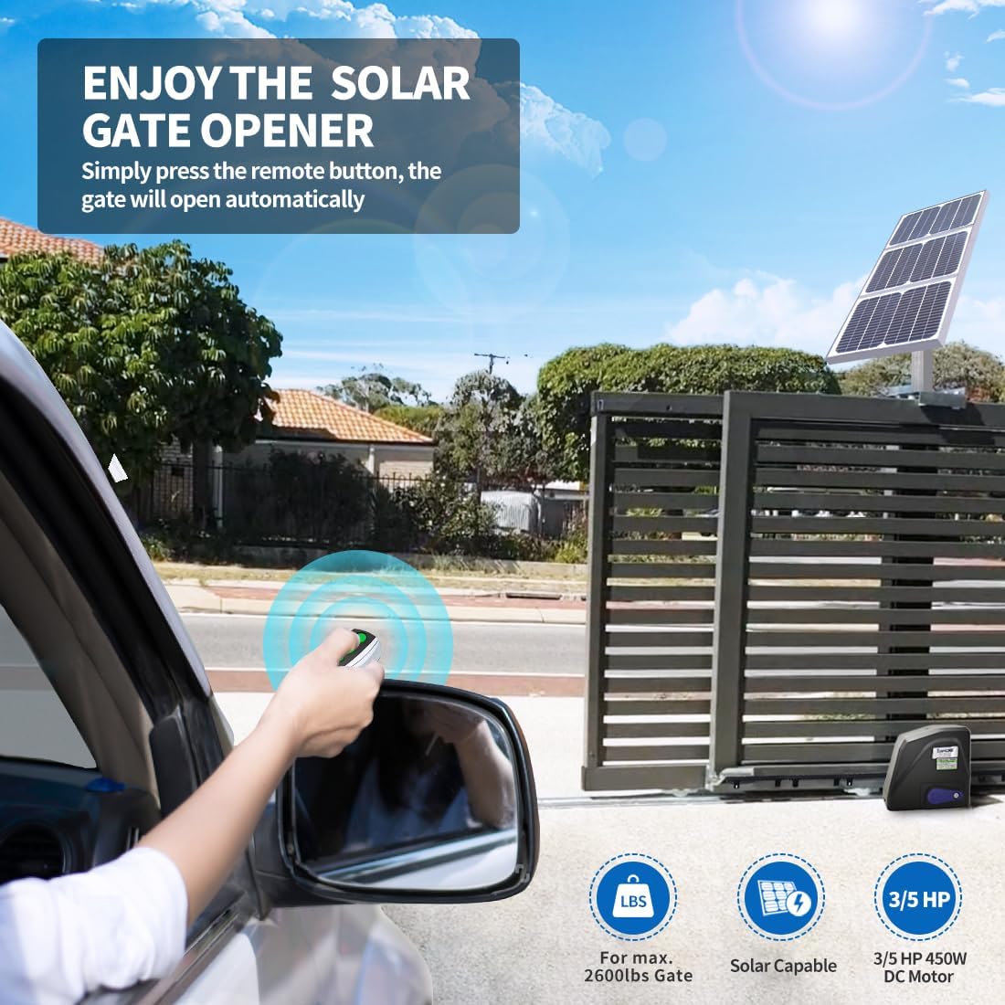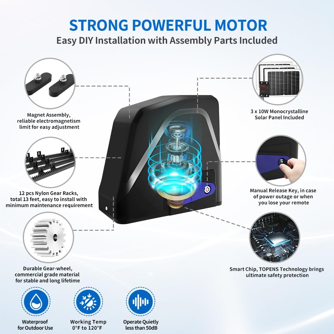 - 【Choose TOPENS】 Over 25 years of specialized experience in gate automation industry. We aim to deliver safe, smart & reliable gate operator systems with long-lasting performance. Equipped with a STRONG 3/5 HP 450W DC motor, DKR1100ST is the most powerful solar sliding gate opener in the market, smoothly driving the heavy-duty slide gate up to max 2600lbs. in weight and max 40ft. in length. This ultra-quiet electric gate motor will bring your family an easier and more comfortable life.