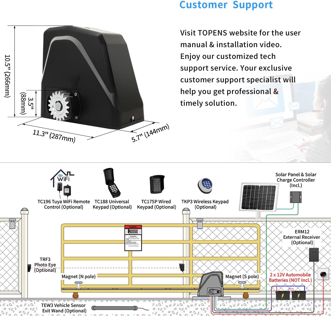 - 【Outstanding Customer Support】 TOPENS provides our customers with the 30-day exchange & return, 12-month war-ranty and excellent tech support. Visit TOPENS website to download the user manual, watch the installation video and enjoy our customized service. We know that each gate is different, so if you have any questions, get in touch with us. TOPENS specialists will help you get professional and timely solution.