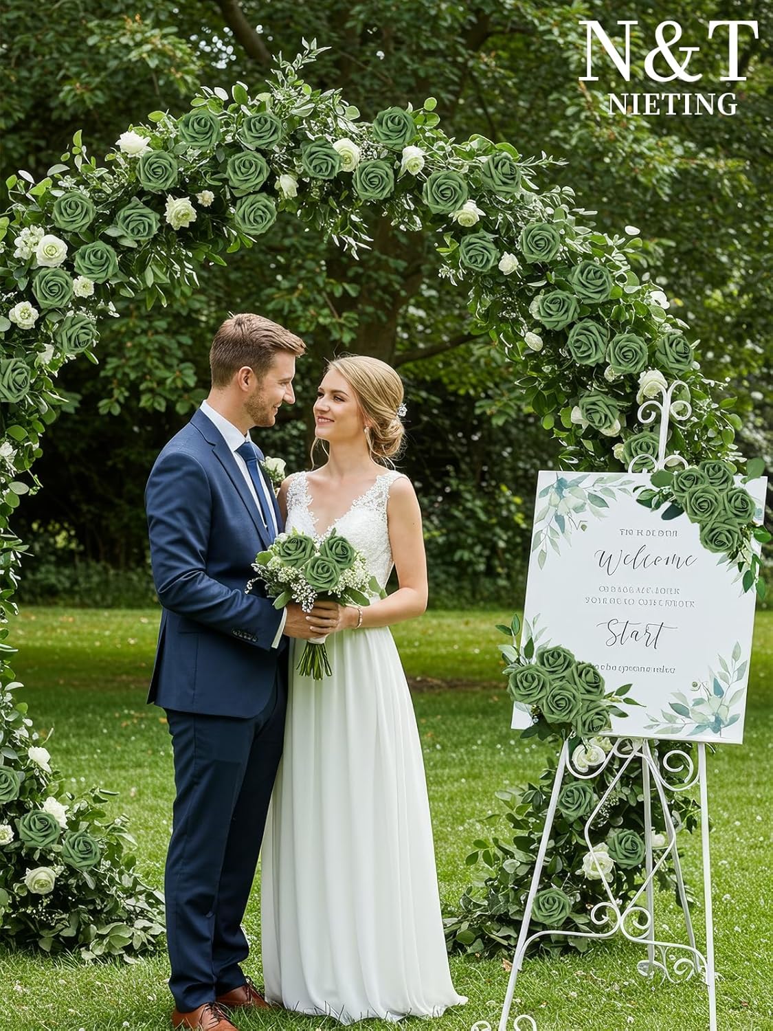 N&T NIETING Artificial Flowers Roses Army Green Foam Rose 50pcs Fake Flowers with Stem for DIY Wedding Bouquets Centerpieces Bridal Baby Shower Party Home Shower Arrangement Decoration