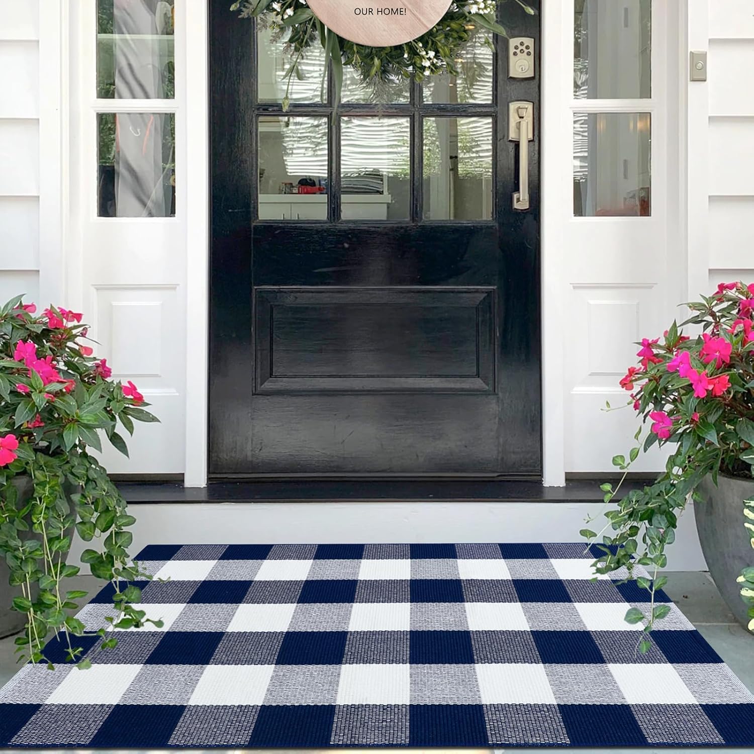 - Easy to Clean: This navy and white checkered rug is simple to maintain with machine wash or vacuuming to remove dirt. The rug is sturdy and can be tumble dried on low. Keep your door rug fresh and clean with minimal effort. NOTE: Cotton rugs normally shrink slightly after washing