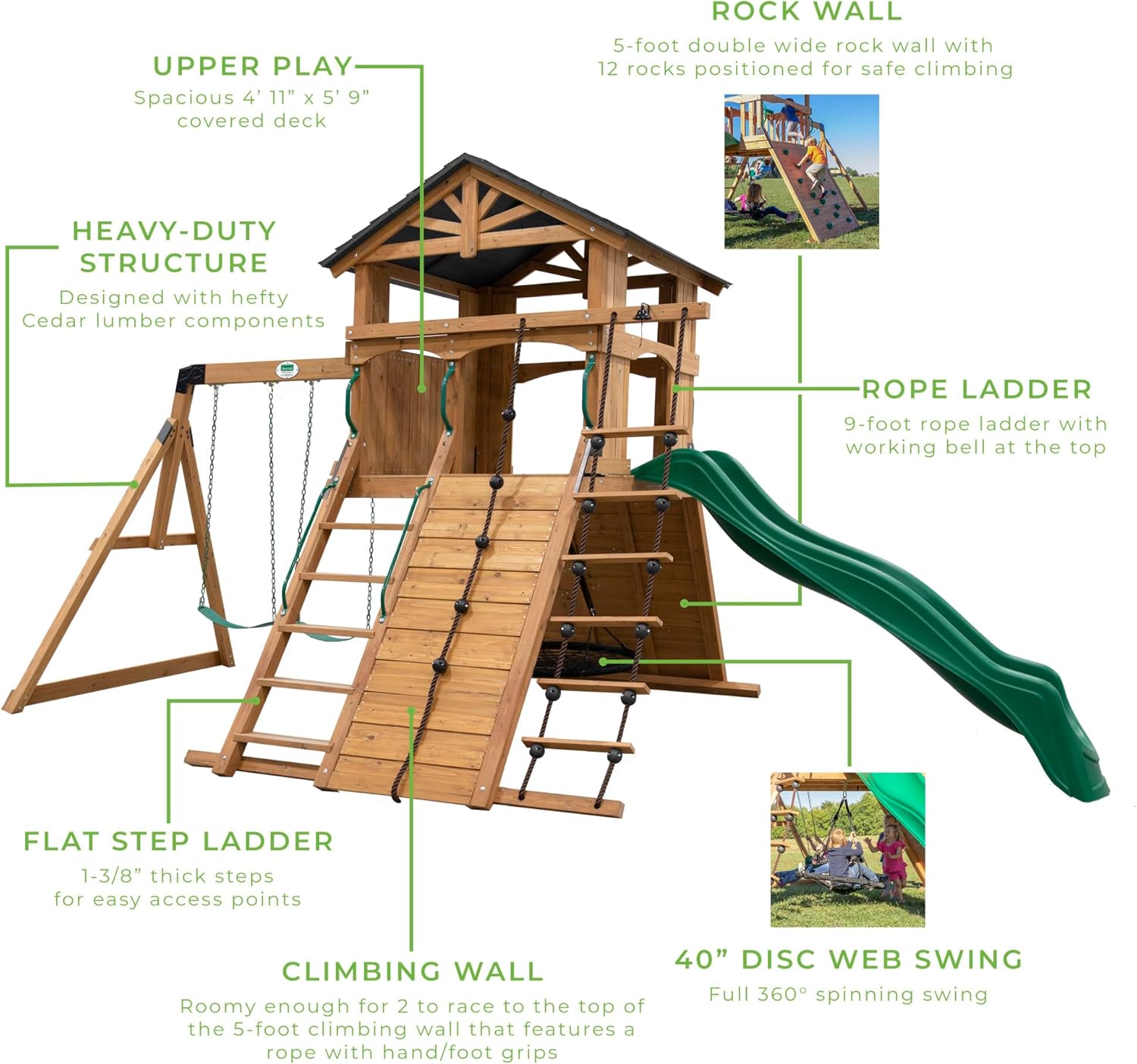 - Climbing Rope Ladder: 9-foot-tall rope ladder with wooden rungs offers adventurous climbing fun, leading to a victory bell to celebrate the summit