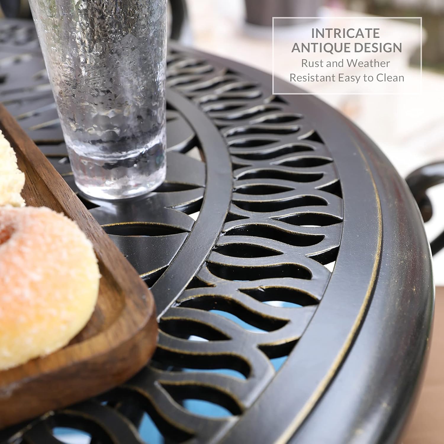 - 【STYLISH APPEARANCE】 - This 3-Piece Dining Set includes 2 stylish and comfortable chairs and 35.4" round cast table. Elegant cast accents scroll across the chairs and table top, adding a level of sophistication and craftsmanship to the collection. Perfect addition to your patio, yard, deck, or porch.