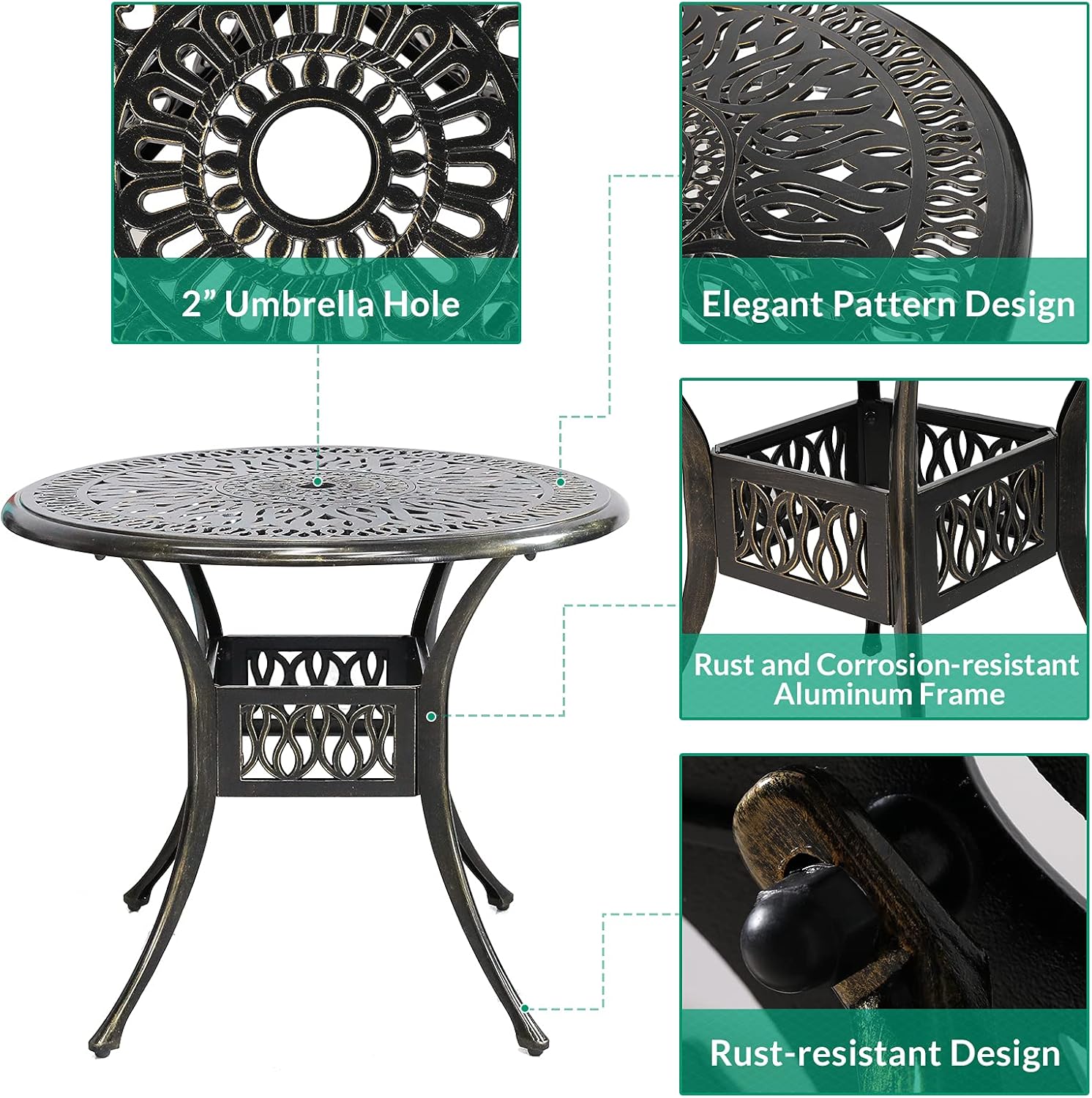 VIVIJASON 3-Piece Patio Bistro Sets, All-Weather Cast Aluminum Bistro Table Set Outdoor Patio Furniture, Include 2 Cushioned Chairs and 35.4" Round Table, 2" Umbrella Hole