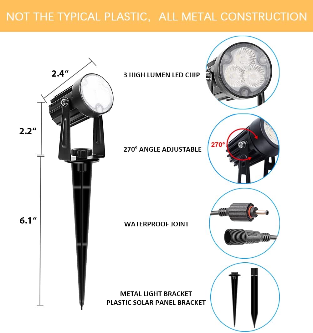- 【2 installation methods】Easy to install:The solar panel and outdoor solar landscape lights can be installed in the ground or mounted on the wall with included screws. Each solar garden spot lights with 118inch/3m cable, 270° Adjustable freely up or down to meet different requirements