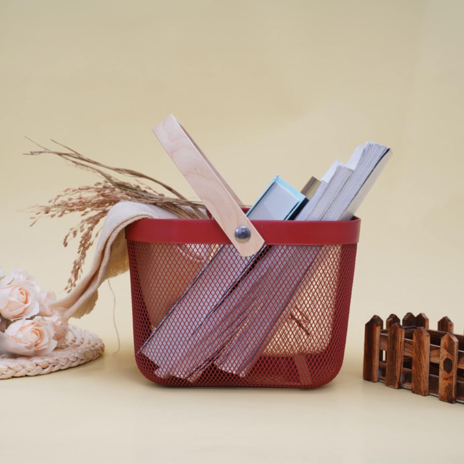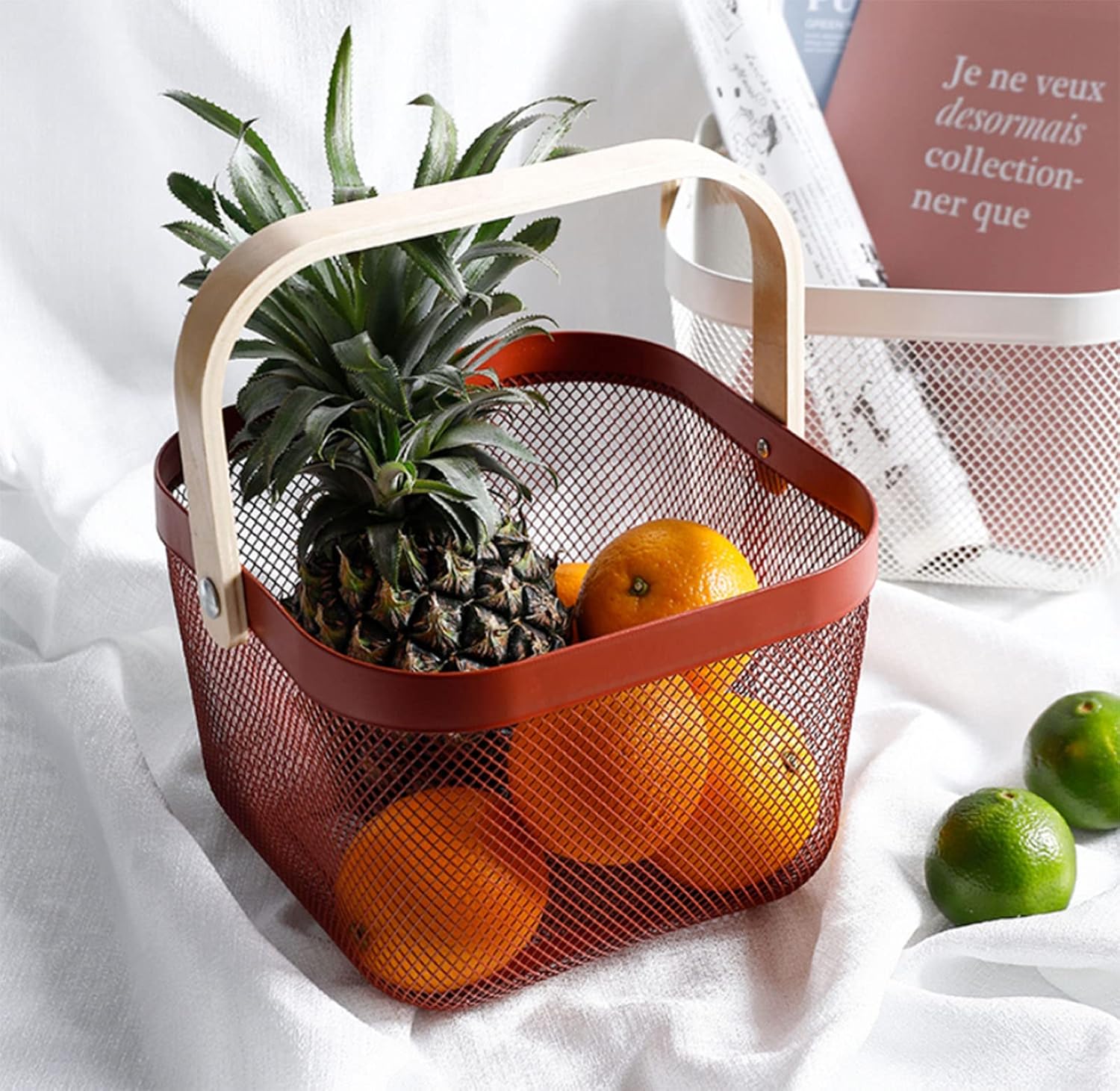 - The metal mesh storage organizer basket bin with wooden handle is a great way to organize or decorate your home, office, apartment, lofts, or other living spaces. This wire basket also can be a fruit basket or garden basket and storing those fruits and vegetables outside the refrigerator. Also as extra storage to meet your needs for household use.