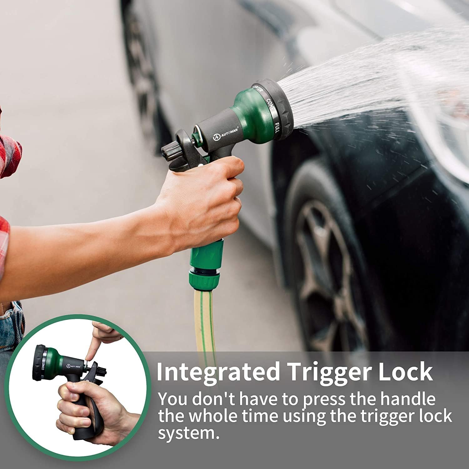 - LABOR-SAVING DESIGN: AUTOMAN garden nozzle features a nice lock bar at the top of the handle that keeps the water remains on without you having to apply any pressure.Just use the lock so you don't have to keep your hand holding it the whole time.