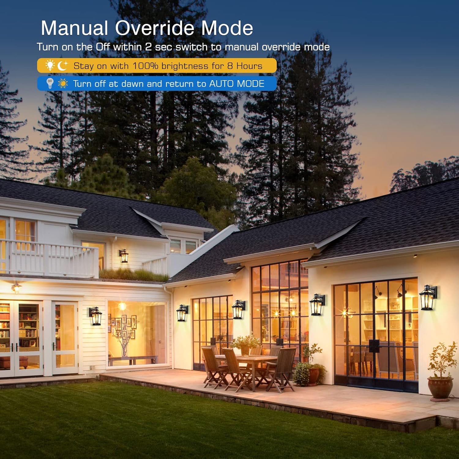 - ✨【ALL-NEW Motion Activated】Experience latest in technology with outdoor motion sensor light! Featuring four working modes. ①DIM mode: 100% brightness at night when motion is detected, and 30% brightness the rest of the time ( adjustable from 15% to 100%). ②ECO Mode: Keep the light off at night, and turn on the light at 100% brightness when motion is detected. ③D2D mode: 100% brightness at night, automatically turn off at dawn. ④Override Mode: Maintains 100% brightness for approximately 8 hours, but automatically turns off at dawn and reverts to the previous operating mode.