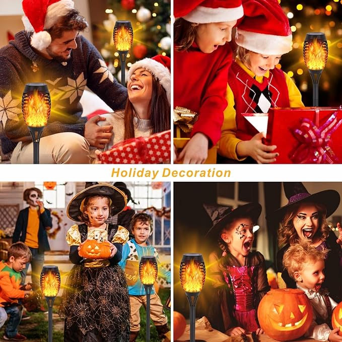 - Upgrade Solar Torches Lights with Flickering Flame: Mini-Size 8LED solar lights outdoor cast a gorgeous, soft, vivid and safe glow, which provide a charming campfire atmosphere for your family. Solar torches are suitable outdoor decorations for patio, garden, yard, porch, making your garden stand out in the community