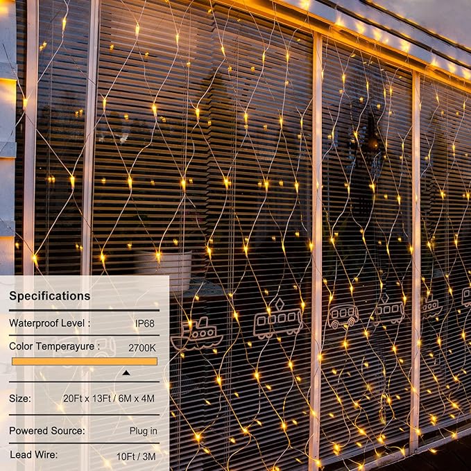 - Fully Waterproof: net string lights is IP68 fully waterproof, which can be used normally even in bad weather outdoors. (note: the adapter is not waterproof, it needs waterproof treatment for outdoor use)