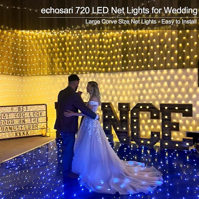 - echosari Large net lights with dimensions of 20ft x 13ft, featuring 720 LEDs on a clear wire mesh. Designed to provide bright and even illumination, ideal for creating a stunning decorative effect