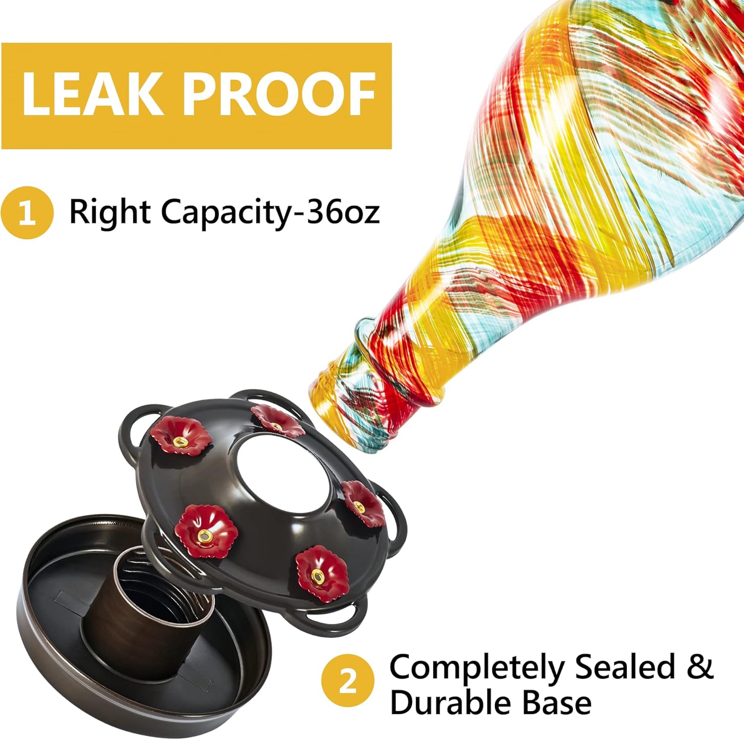 - LEAK PROOF: This vintage glass hummingbird feeder features a convenient 36 fluid ounces capacity, a slender shape and a completely sealed base that has the least leaking, drips and spills