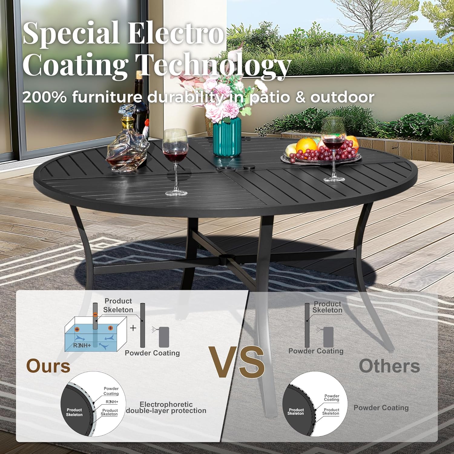 - Premium Material: Metal dining table, thick slatted metal table top, rust and weather resistant. Powder-coated matte finish, UV resistant and easy to clean with a damp cloth. Non-slip feet are suitable for uneven ground and prevent floor scratches