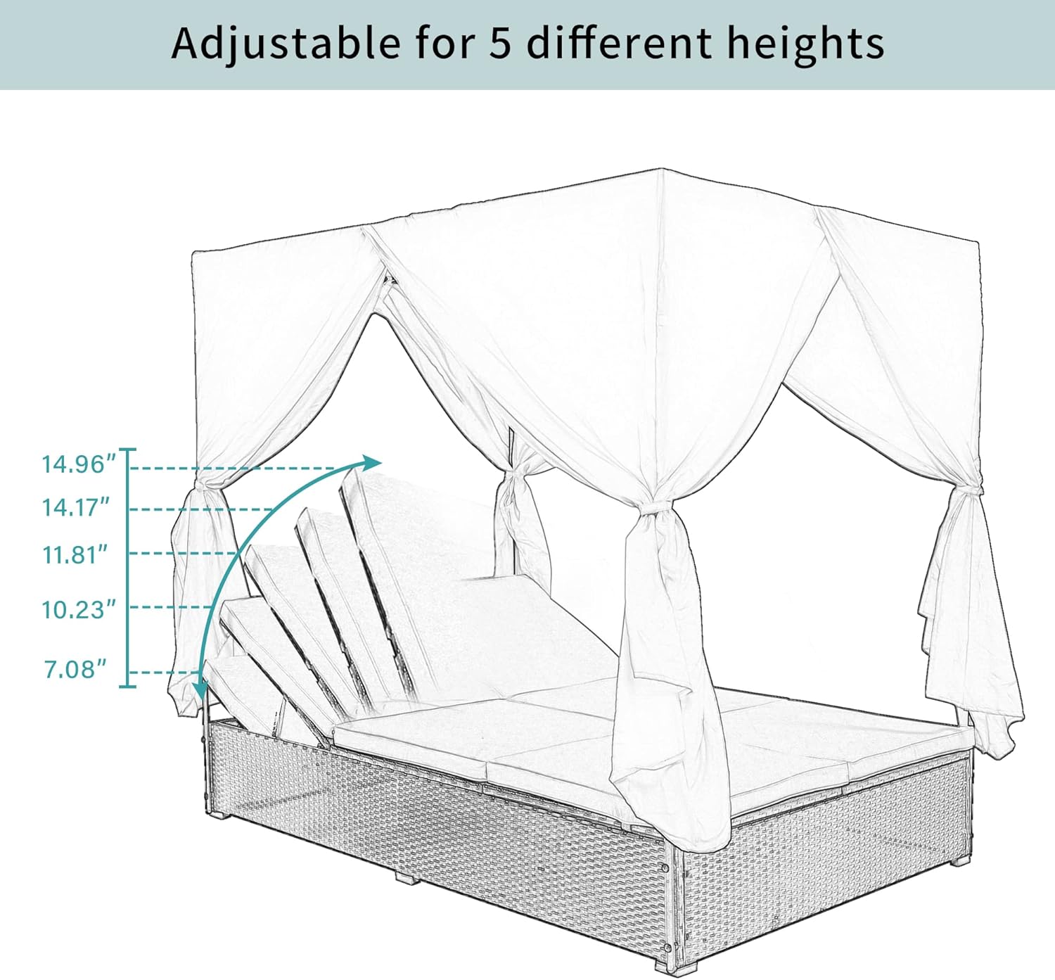 - 【Perfect Outdoor Furniture】This stylish rattan rectangle sunbed has side and overhead curtains to provide both shade and privacy. It is suitable for 2-6 people to lie or sit. Create a new vision for your balcony, garden, backyard or poolside.