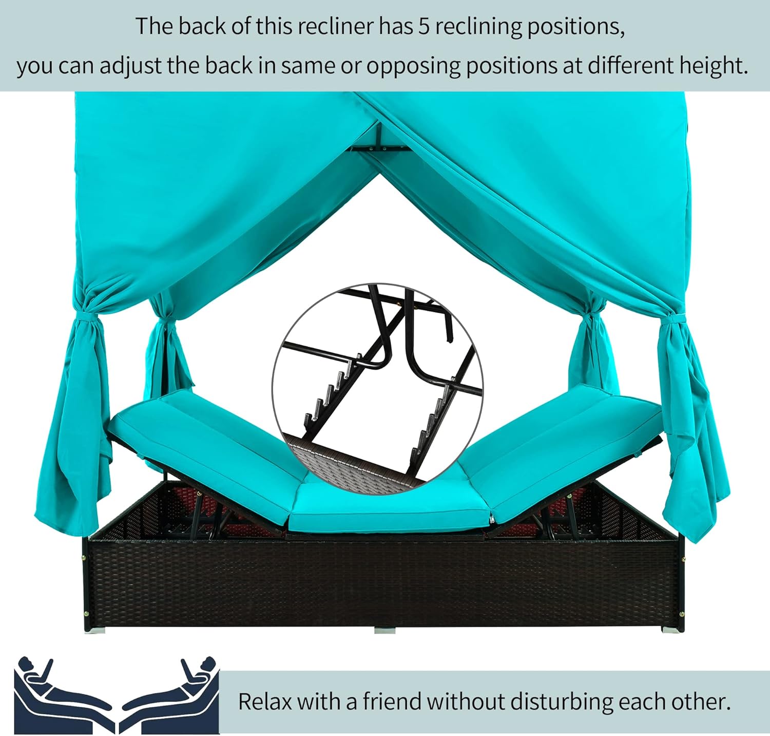 Patio Chaise Lounge, PE Rattan Outdoor Patio Wicker Sunbed Daybed with Adjustable Seats, Four-sided Canopy, Overhead Curtain and Blue Cushions for Backyard, Garden, Poolside (for 2-6 people)