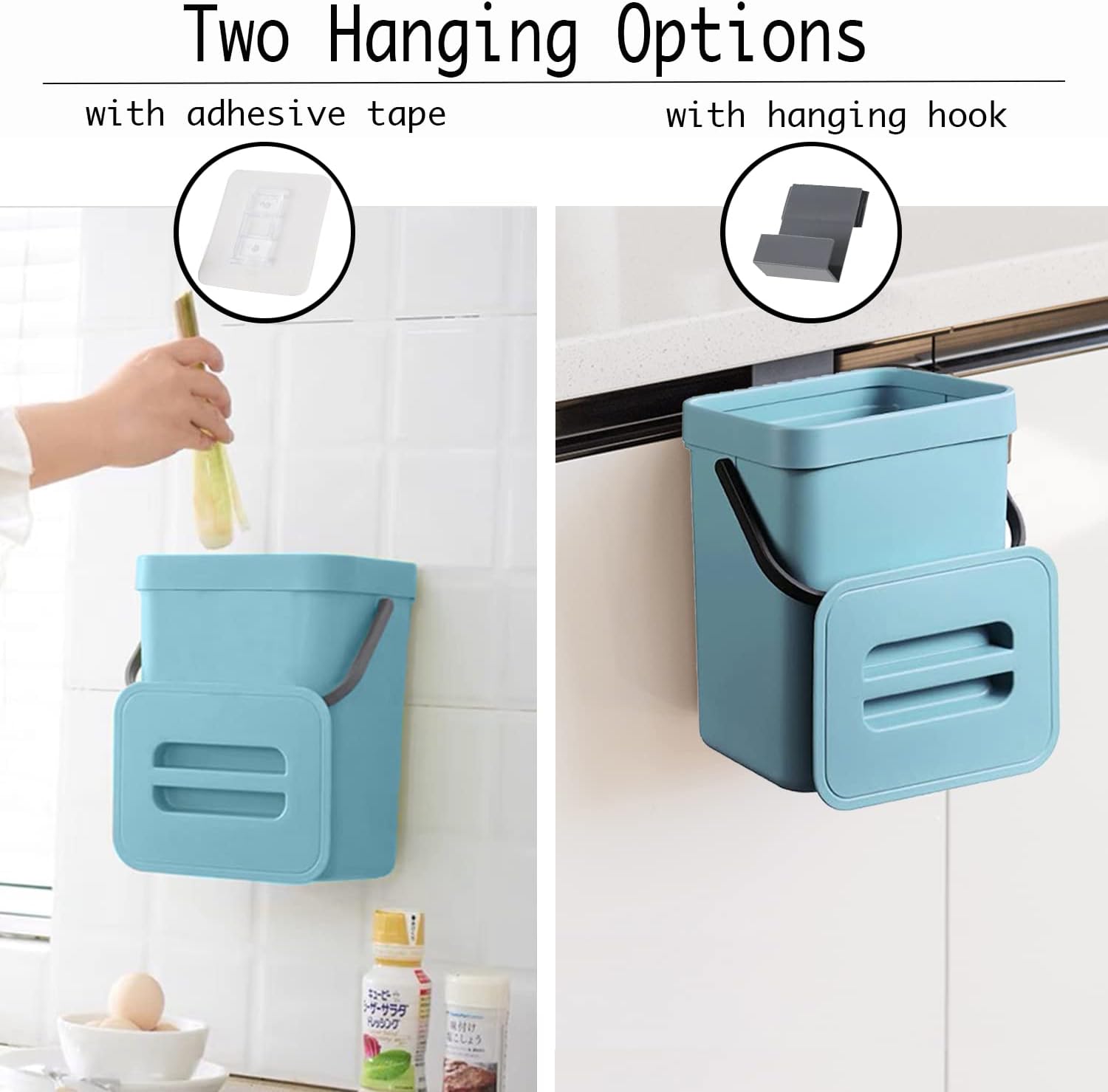 - Wall Mount/Under Sink/Countertop Trash Can: The small trash can could be easily hung on kitchen cabinet doors, pantry doors. (The thickness of the door should be less than 0.86 inch) Moreover, this food waste basket can also be wall-mounted to under sinks, cupboard, kitchen wall or bathroom wall with adhesive pad or screws.