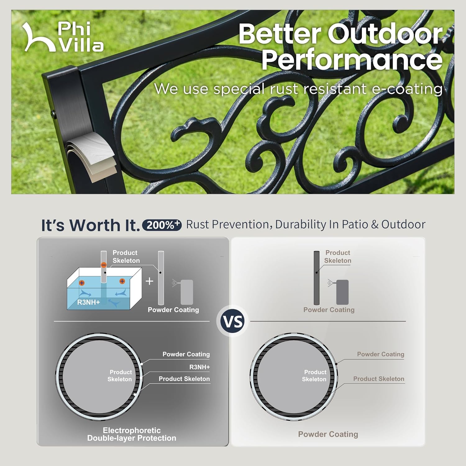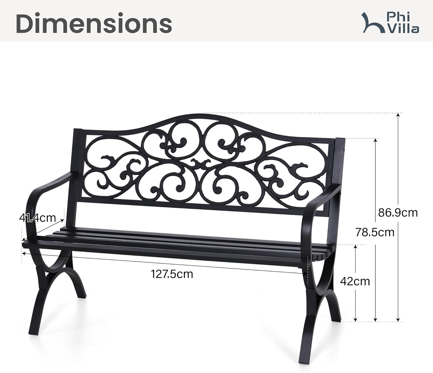 PHI VILLA 50-Inch Cast Iron Steel Frame Garden Bench Outdoor Patio Bench Chair w/Floral Design Backrest, Slatted Seat for Park, Yard & Porch, Black