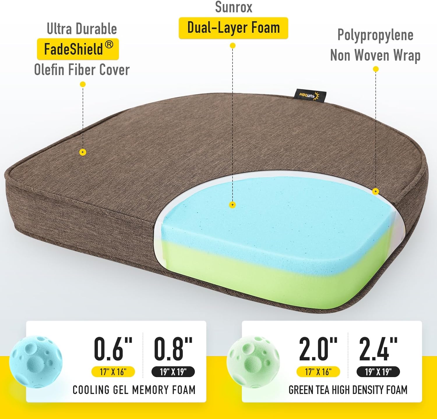 SUNROX Gel Memory Foam Chair Cushions, FadeShield Water-, Stain-Resistant Durable Reversible Seat Cushion Pads with Ties for Indoor/Outdoor Kitchen Dining Office 17"x16" Set of 6, Heather Chestnut