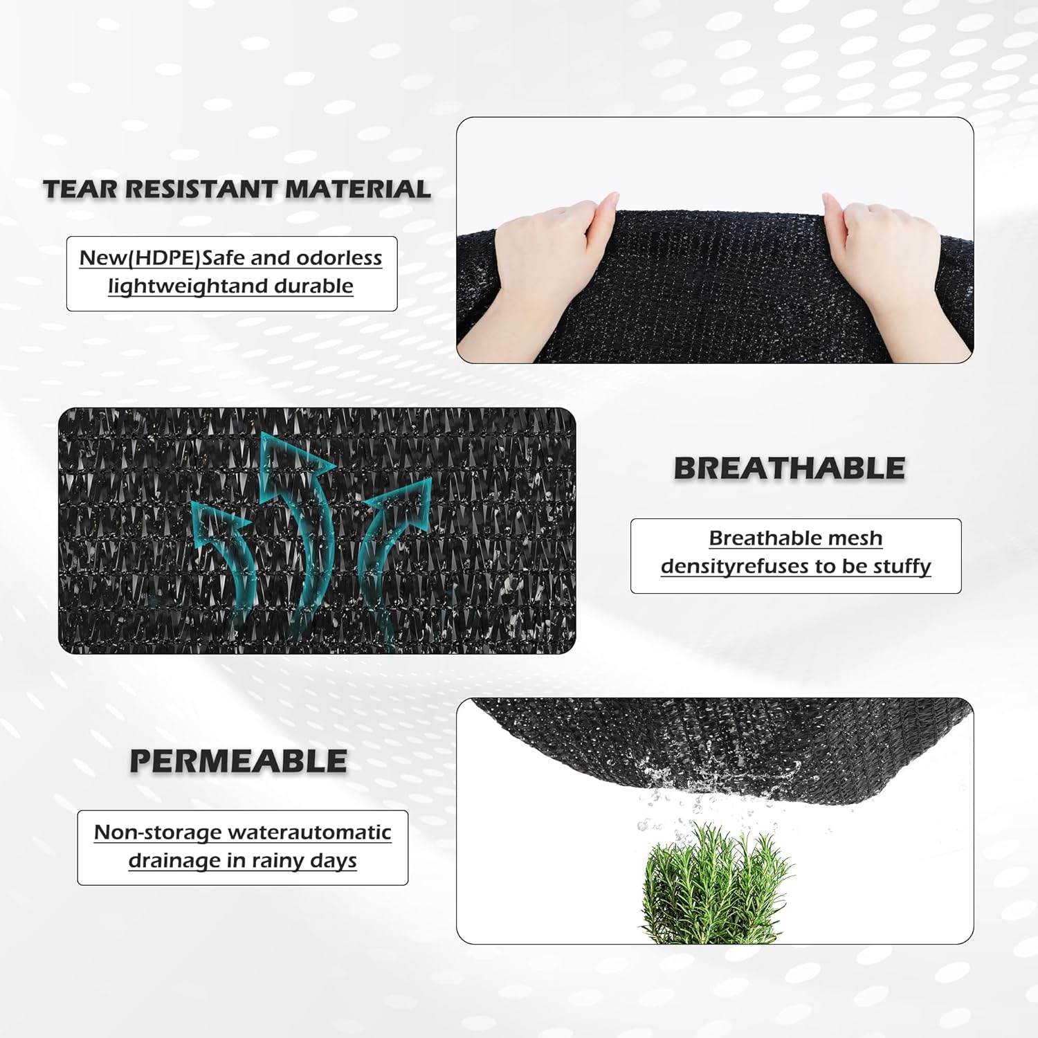 - 70% High Shading Rate - Provide up to 70%-75% shading rate, which can provide a good shading effect for people, animals and plants; the breathable material keeps the plants from drying out, while providing a good ventilation effect and allowing rainwater to penetrate