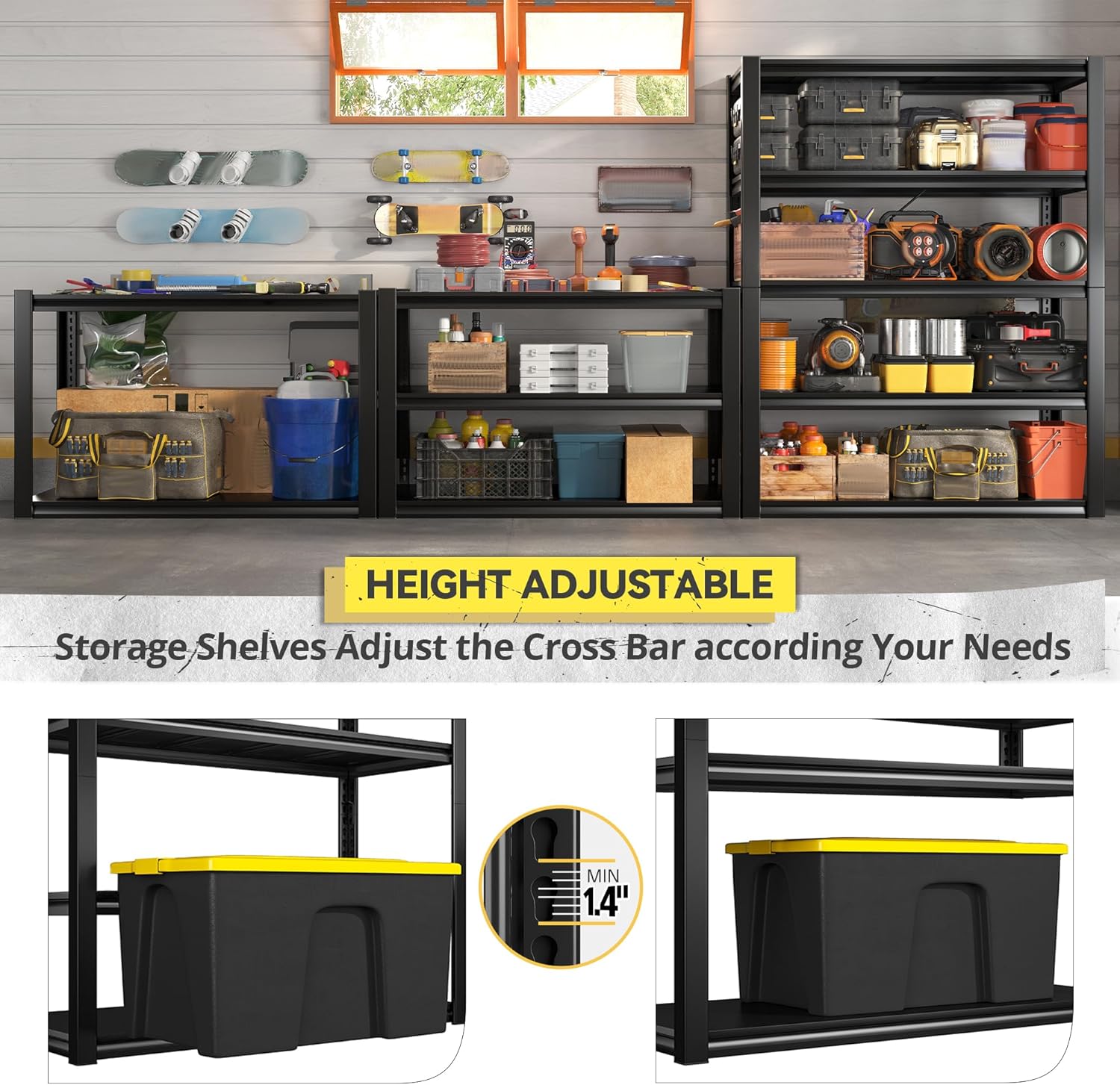 - 【2500LBS Capacity Heavy Duty Shelving】Made of all heavy duty metal, this 5-tier garage shelving heavy duty holds 500 lbs and 2500 lbs in total, perfect for loading heavy items like tires, garage gears, cans, jars and etc. Differ from wood boards, our garage shelving will not break and fall apart, with no chemical material used, this metal shelving stays durable and sturdy as well
