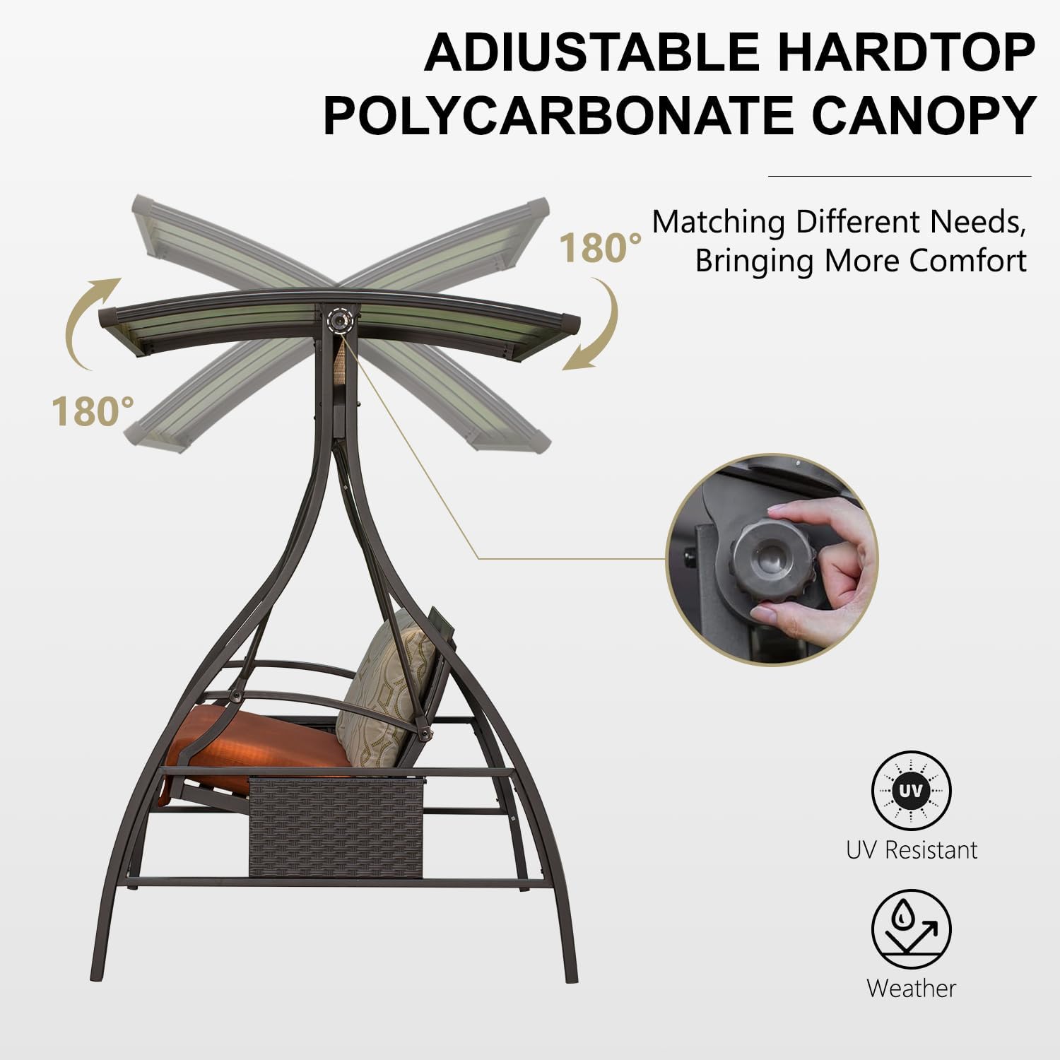 Domi Porch Outdoor Patio Swing with Adjustable Hardtop Polycarbonate Canopy, 3-seat Swing Chair Bench with Solar LED Light for Backyard Yard Poolside Porch Lawn, Cushion and Pillows Included