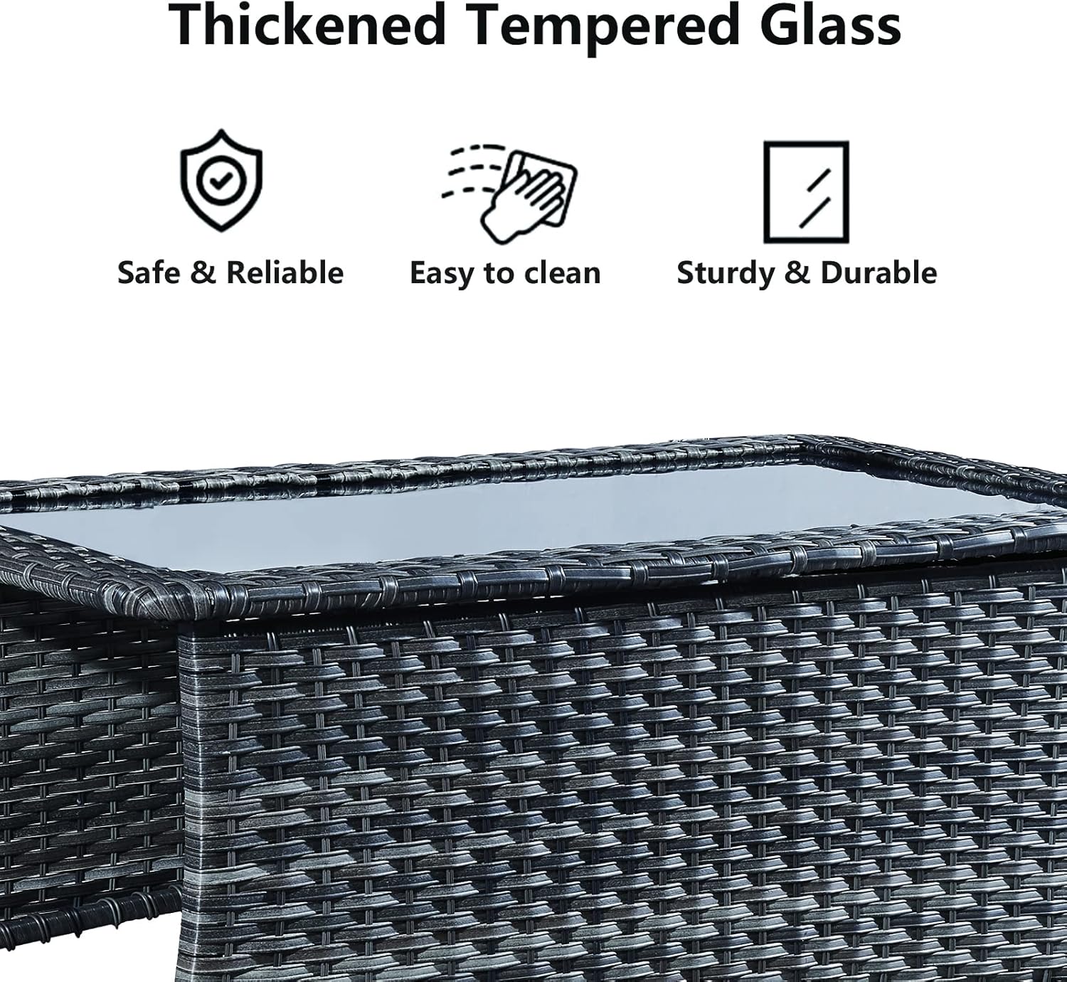 - STORAGE & STURDY - This cafe table with storage features,large storage space makes it easy to store Ottomans underneath.The outdoor table features a 5mm black tempered glass top, which not only provides strong support for daily use, but also makes it look more elegant.