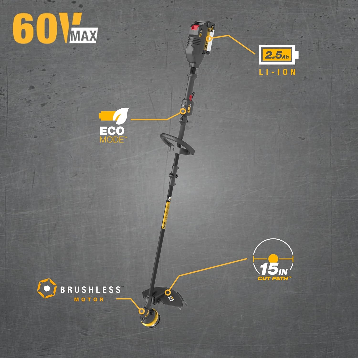- INCLUDES: 60V 15” Cordless String Trimmer, (1) Quick Load Head, (1) Debris Shield, (1) 60V 2.5Ah Battery, (1) 3A Charger