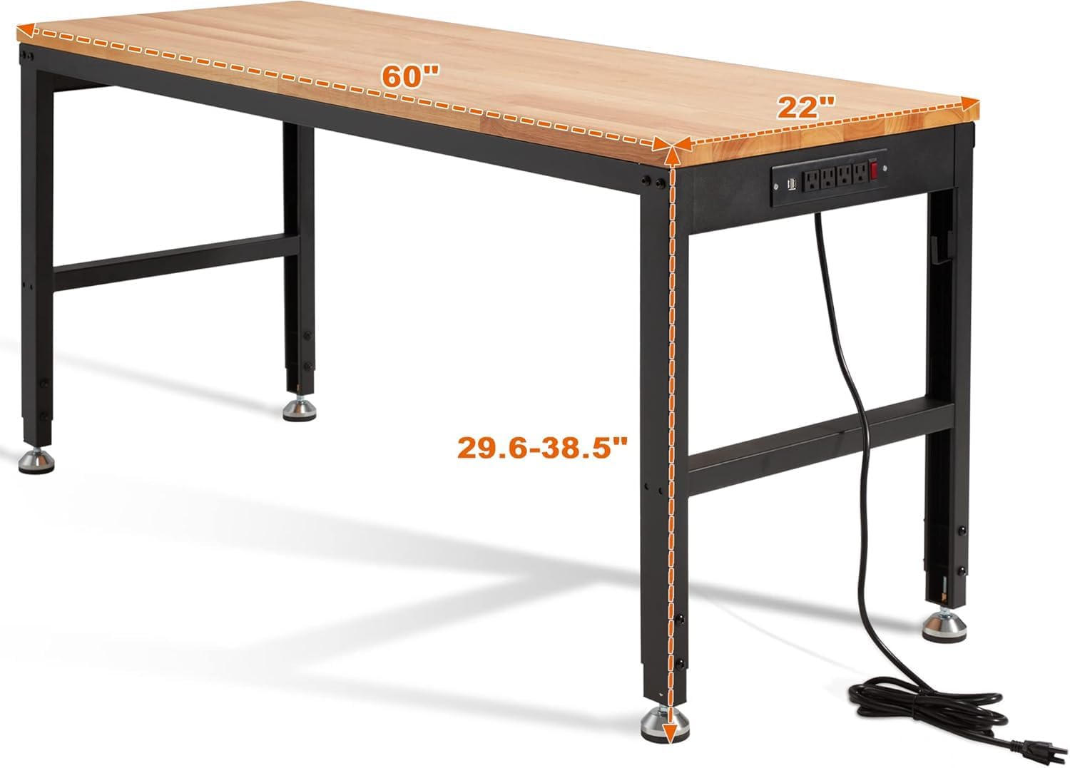 - Easy Assembly & Measurement: Pre-drilled holes on wood top and steel frame help to easily assemble the work bench; Overall dimension: 60"L x 22"W x 38.5"H; Height range from 29.6’’ to 38.5’’